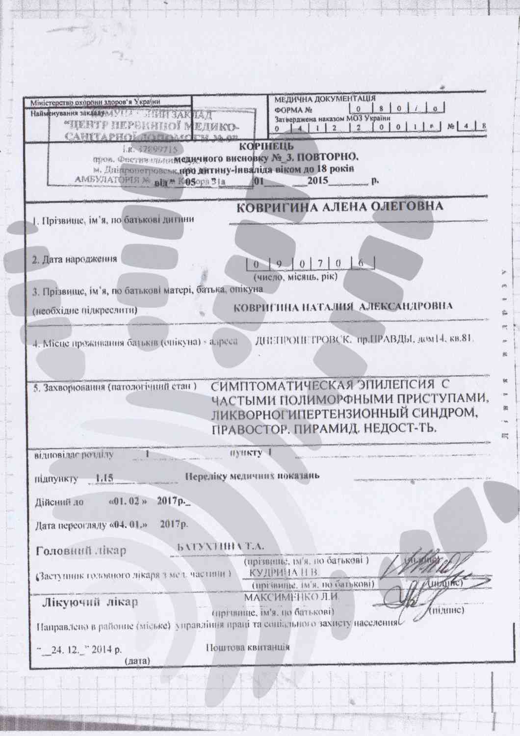 Діагноз: симптоматична епілепсія з частими парціальними вторинно-генералізованими нападами, внаслідок перенесеного вірусного енцефаліту.