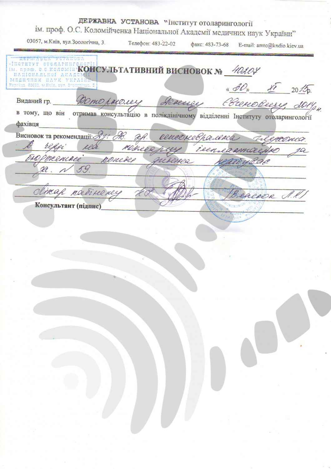 Діагноз: двостороння нейросенсорна глухота ІV ступеню.