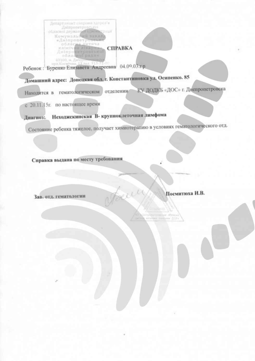 На «швидкій» Лізу з мамою відправили до Харківської лікарні. Дівчинку повністю обстежили і поставили діагноз – «неходжкінська В-крупноклітинна лімфома». Впоравшись із шоком, мама Світлана стала планувати подальше лікування доньки. Було прийнято рішення їхати в Дніпропетровськ – онкологія тут на трохи більш високому рівні, до того ж тут знімає кімнату далека родичка – все-таки підстраховка у вигляді житла і моральна підтримка.
