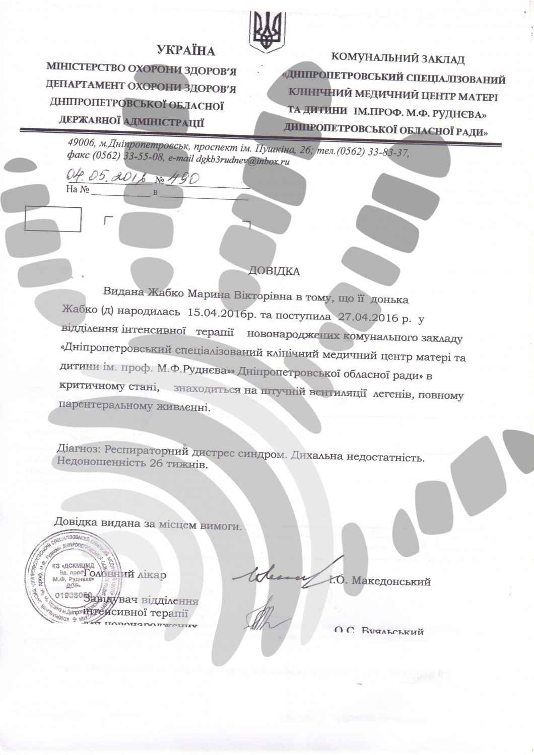 Її мама Марина відчула себе погано на 6-му місяці вагітності. Раптово підскочив тиск, «збити» не змогли, довелося викликати «швидку». З села Вільне Криничанського району жінку доставили в реанімацію 9-їлікарні Дніпродзержинська, але виявивши, що у вагітної відмовляють нирки, переправили до Дніпропетровської обласної лікарні ім. Мечникова. Щобизберегти життя мамі й немовлятку, медики прийняли рішення провести кесарів розтин.