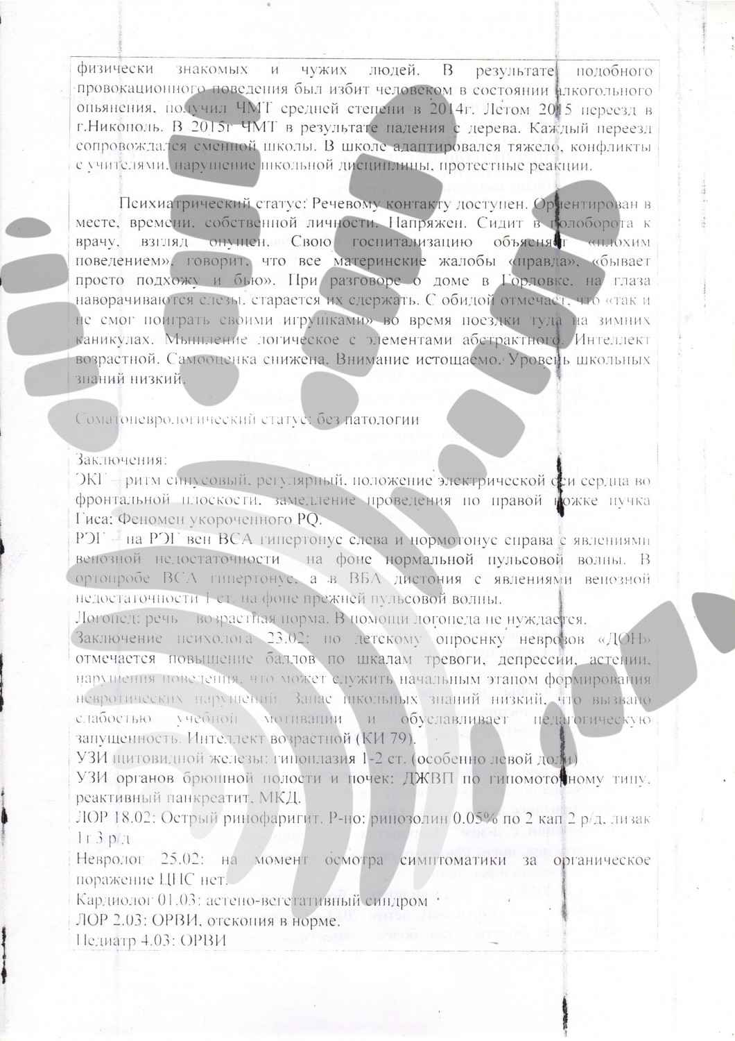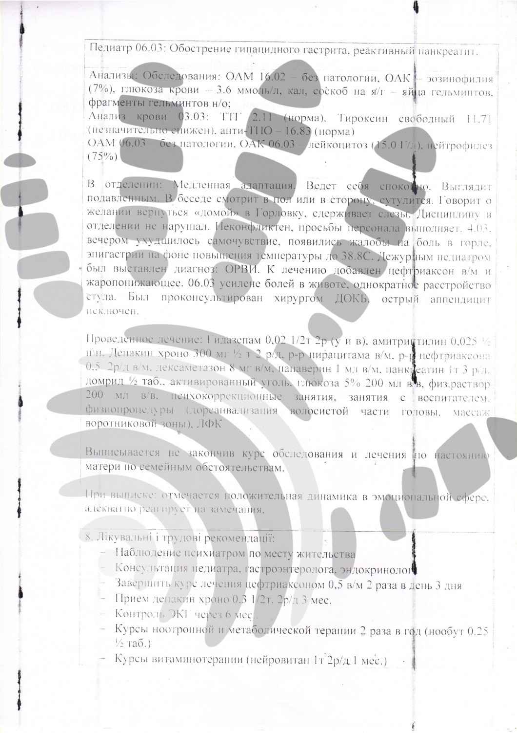 У лікарняній виписці сухо сказано: «У 2014 році був свідком бойових дій, із мамою ховався в підвалі будинку, влітку 2014 переїхав. Після переїзду став часто хворіти, став більш протестним, може зачіпати словесно й фізично знайомих і чужих людей [...] При розмові про будинок у Горлівці на очі навертаються сльози, намагається їх стримати. З образою зазначає, що «так і не зміг пограти своїми іграшками» під час поїздки туди на зимових канікулах. Кожен переїзд супроводжувався зміною школи. У школі адаптувався важко, конфлікти з вчителями, протестні реакції ».