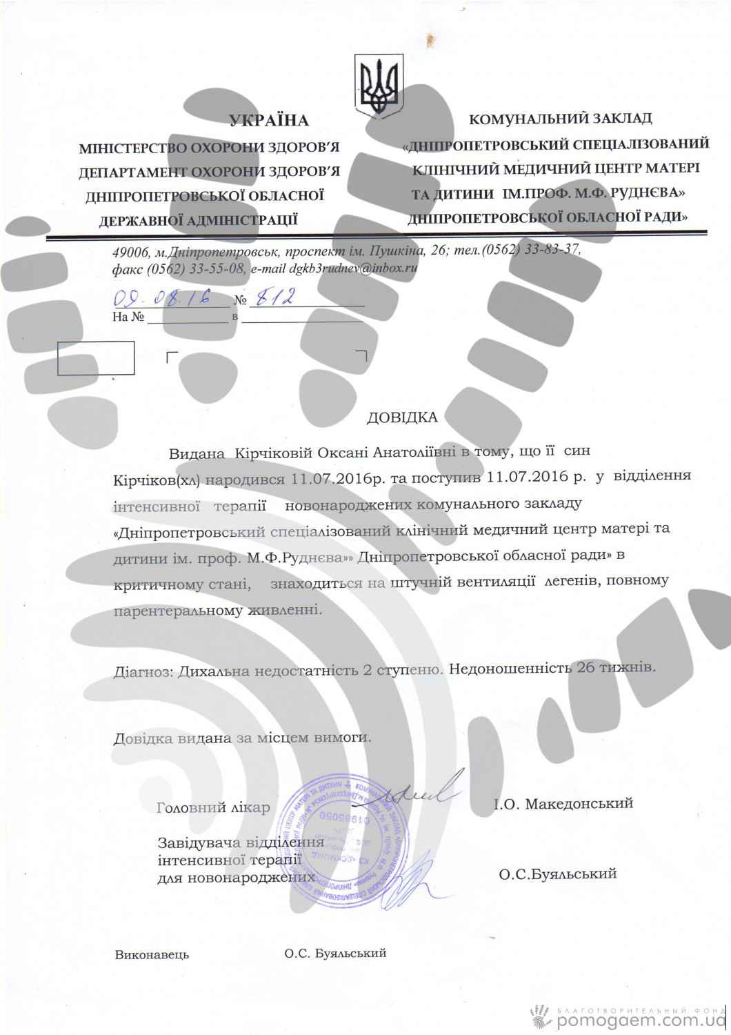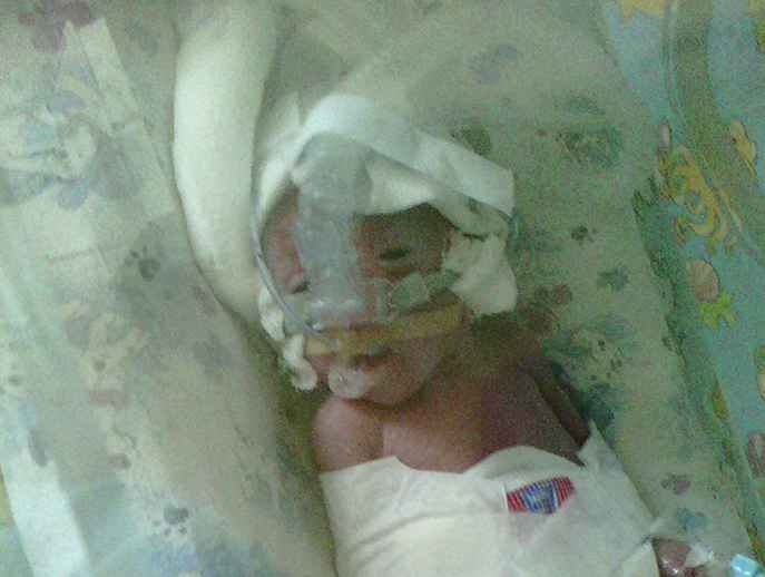 Новонароджене малятко місяць пролежало на апараті штучної вентиляції легенів. Потім лікарі спробували відключити ШВЛ, але незабаром у хлопчика сталася зупинка дихання. Зараз немовля дихає через маску, іноді залишається без неї та тренується дихати самостійно.