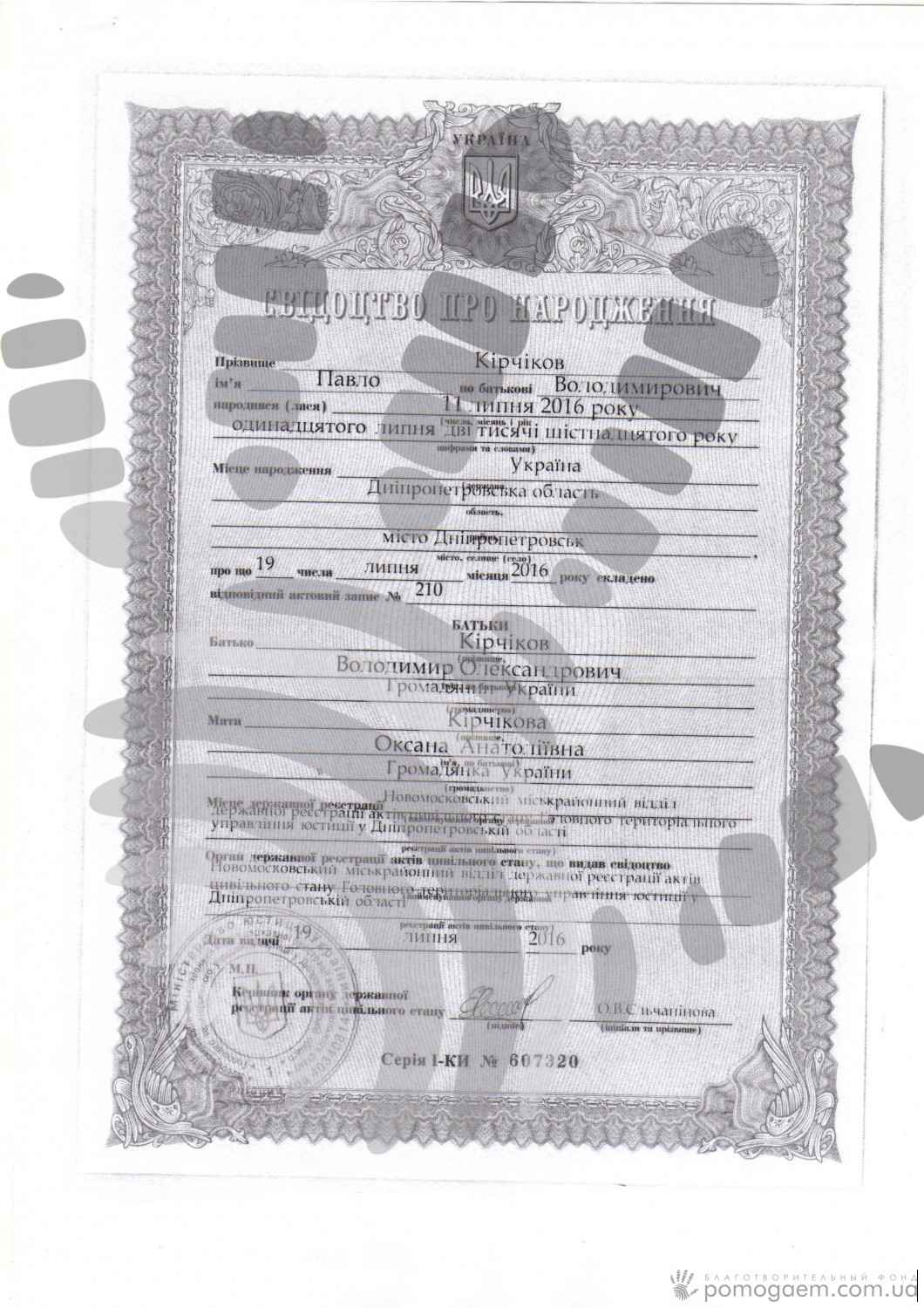 Паша Кірчіков народився 11 липня 2016 року. На жаль, не було урочистої виписки, щасливих батьків, які позують перед фотографом із мереживним згортком. Постійна тривога й страх втратити немовля – ось що відчувають зараз батьки. Адже Паша народився на 26 тижні з вагою 800 г і зростом 31 см. Досі хлопчик не може дихати самостійно.