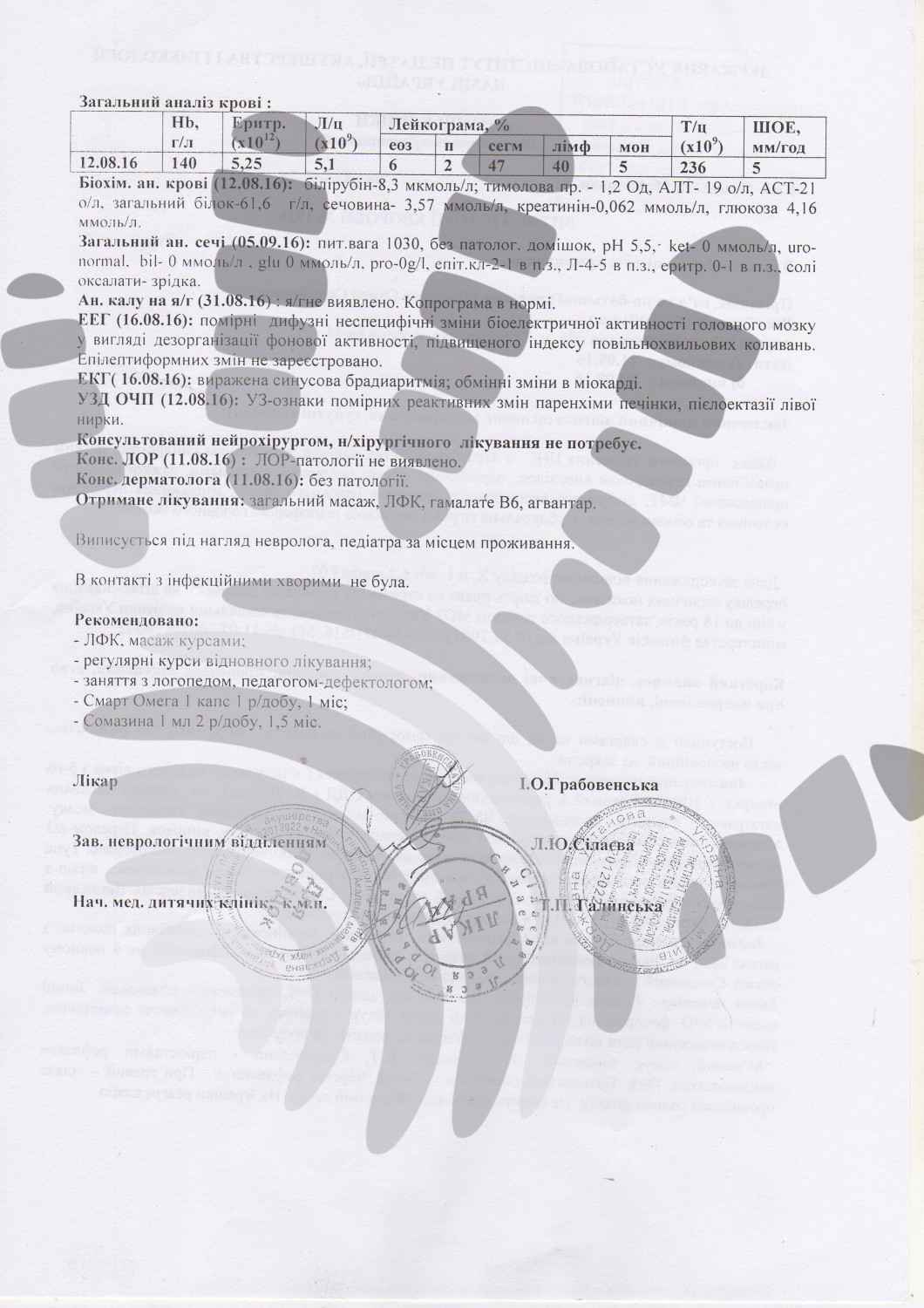 Діагноз: Органічне ураження ЦНС з втратою здобутих навиків, атактичним синдромом, легким правобічним геміпарезом внаслідок перенесеної важкої поєднаної кататравми.