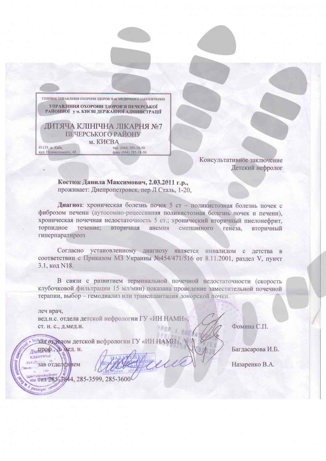 У Дані вроджена полікістозна хвороба нирок та фіброз печінки. Поневіряння по лікарнях, уколи й прийом ліків – все це з великими труднощами підтримує стан дитини. Але недуга невблаганна, нирки відмовляють. Хлопчику терміново потрібна пересадка трупної нирки, яку в Україні не роблять (батьки не підходять в якості донорів). Їм залишається спостерігати за згасанням дитини або шукати кошти на операцію за кордоном. Трансплантація в Білорусі обійдеться в 61 000 євро.