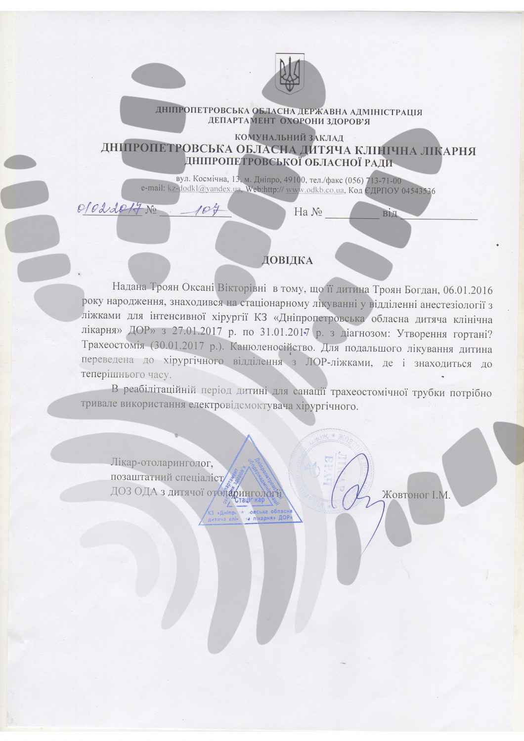 Цієї осені Богданчик застудився. 11 листопада почалися нежить і кашель. Мама зателефонувала лікареві, той порадив приймати Лазолван. Температура не піднімалася вище 37.2, тому батьки не дуже хвилювалися. А вже через три дні малюк став так важко дихати, що мама викликала швидку. Богдана відвезли до Томаківської районої лікарні, там знімок показав двосторонню пневмонію, й дитину того ж дня переправили до Дніпропетровської обласної дитячої лікарні.