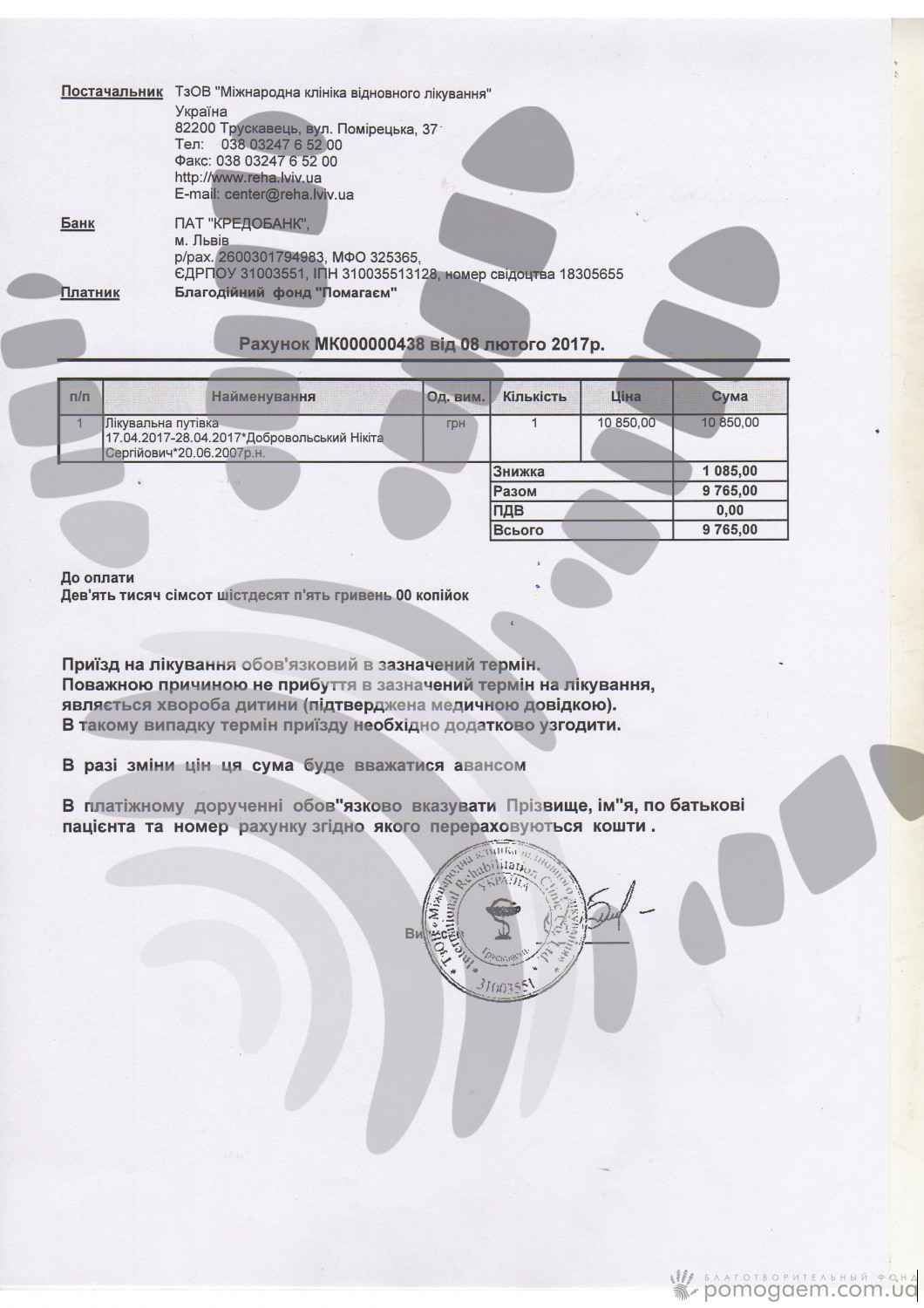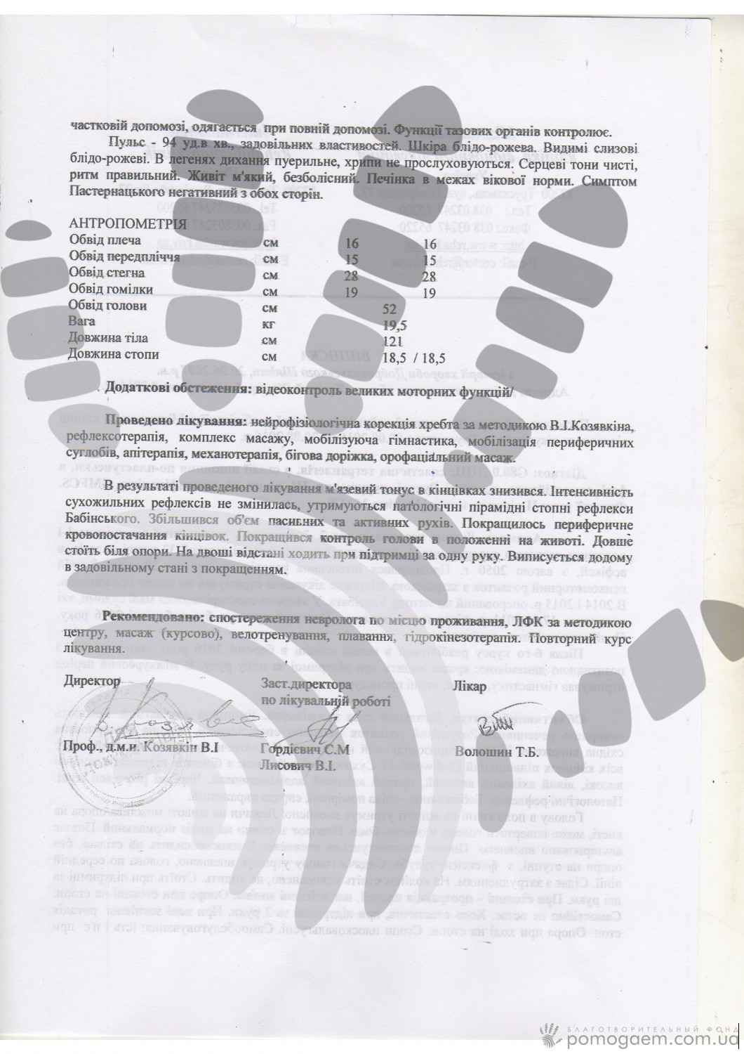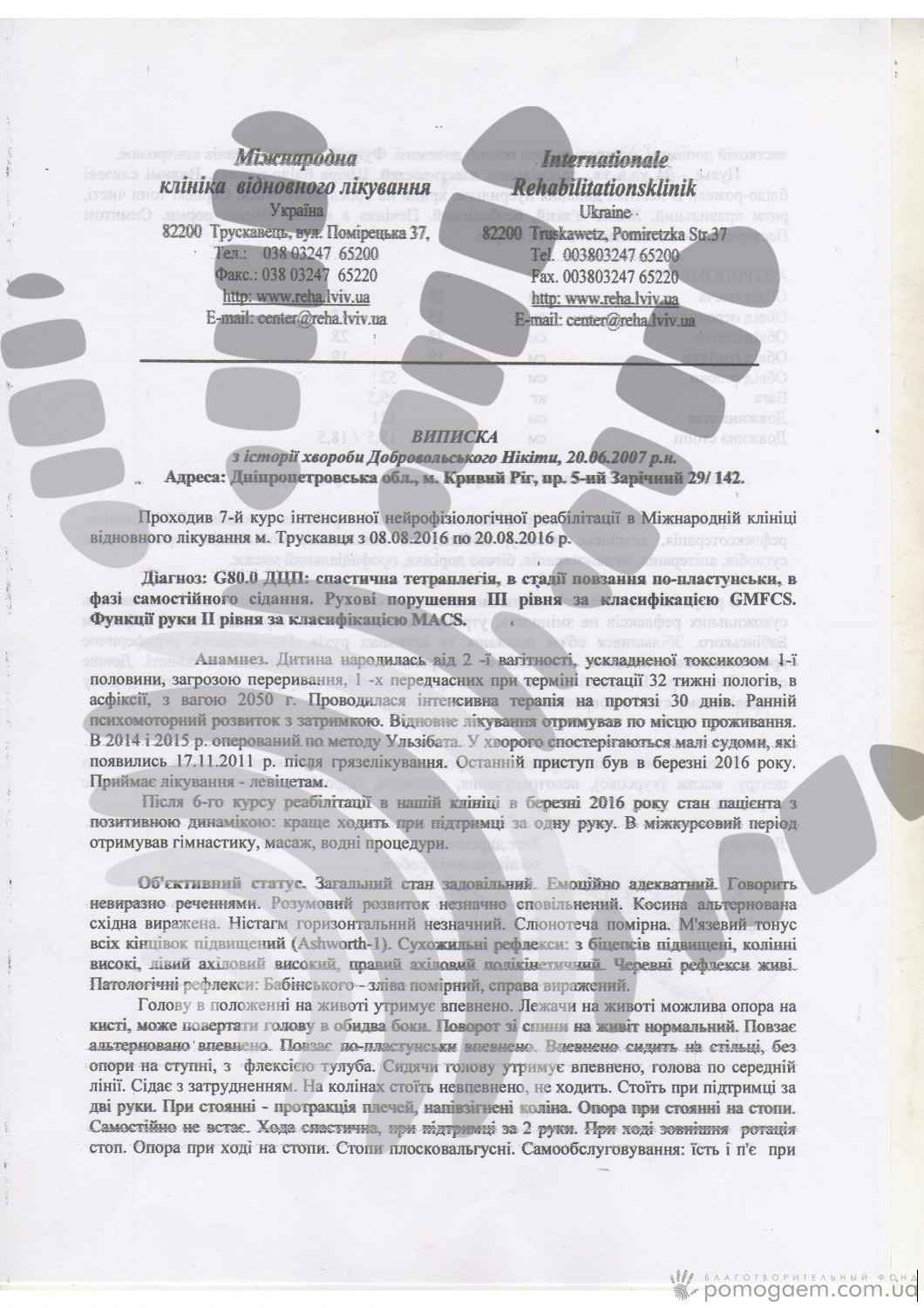 Відновлювальні курси дають хороший ефект, якщо проходити їх регулярно. Але сім'ї, яка виховує дитину з інвалідністю, дуже складно знайти 8-15 тисяч гривень 3-4 рази на рік. Тому без допомоги небайдужих людей хлопчику ніяк не обійтися. Квітнева путівка до Міжнародної відновної клініки буде коштувати для нього 9 765 грн. Віримо, що ви допоможете хлопчикові зробити черговий крок у розвитку!