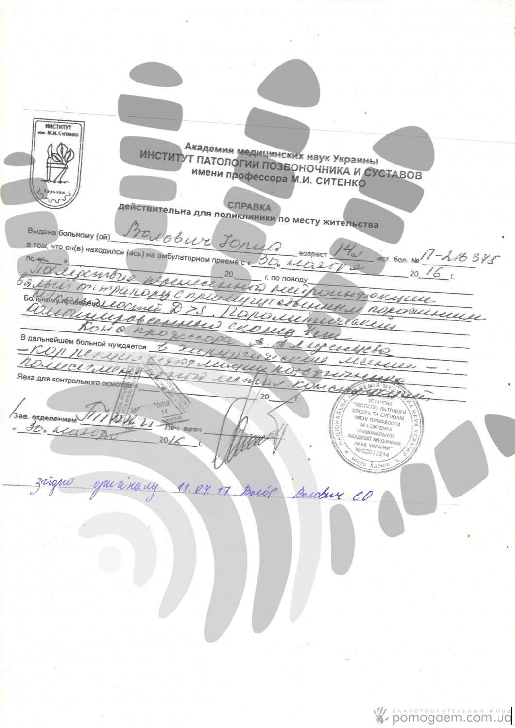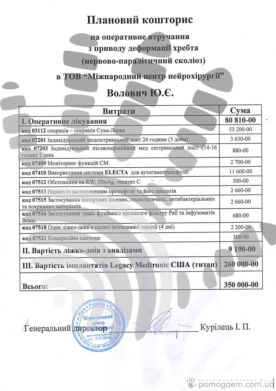 Проте, стан хребта вимагає термінового хірургічного втручання. Якщо зараз не зробити операцію, скоро хлопчик не зможе навіть сидітий повзати, почнуться проблеми з диханням та іншими внутрішніми органами, стиснутими в неприродному положенні.