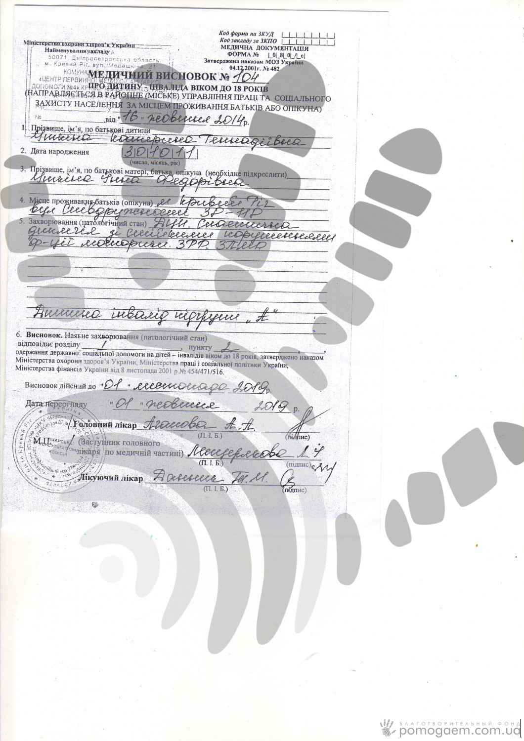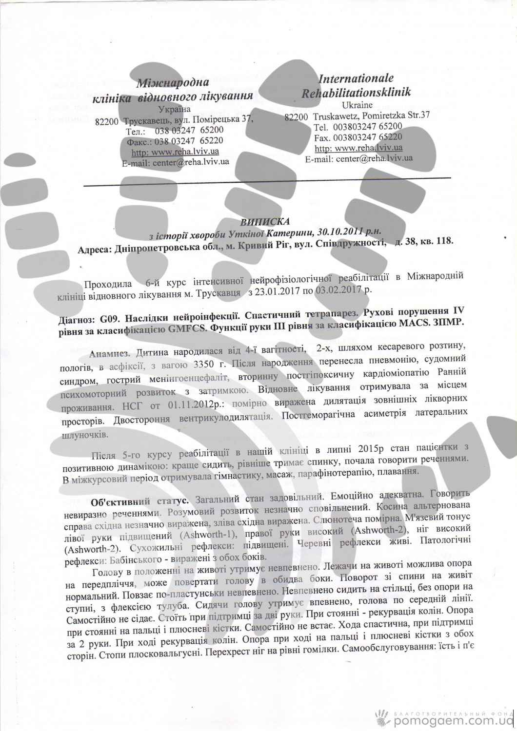 У Каті ДЦП. Але батьки не опускаютьруки й намагаються дати Катрусі всі можливі шанси. У списку реабцентрів, у яких побуваладівчинка, заклади далеко за межами її рідного Кривого Рогу: «Хаджибей», «Апіс Меліфіка», «Солоний лиман», «Будинок з Ангелом», Міжнародна відновна клініка. Укінці травня планується операція на сухожиллях за методикою Ульзібата: вона дозволить ніжкам дівчинки стати більш рухливими.