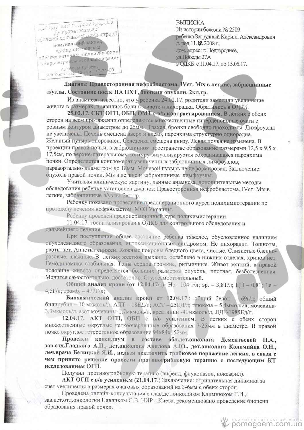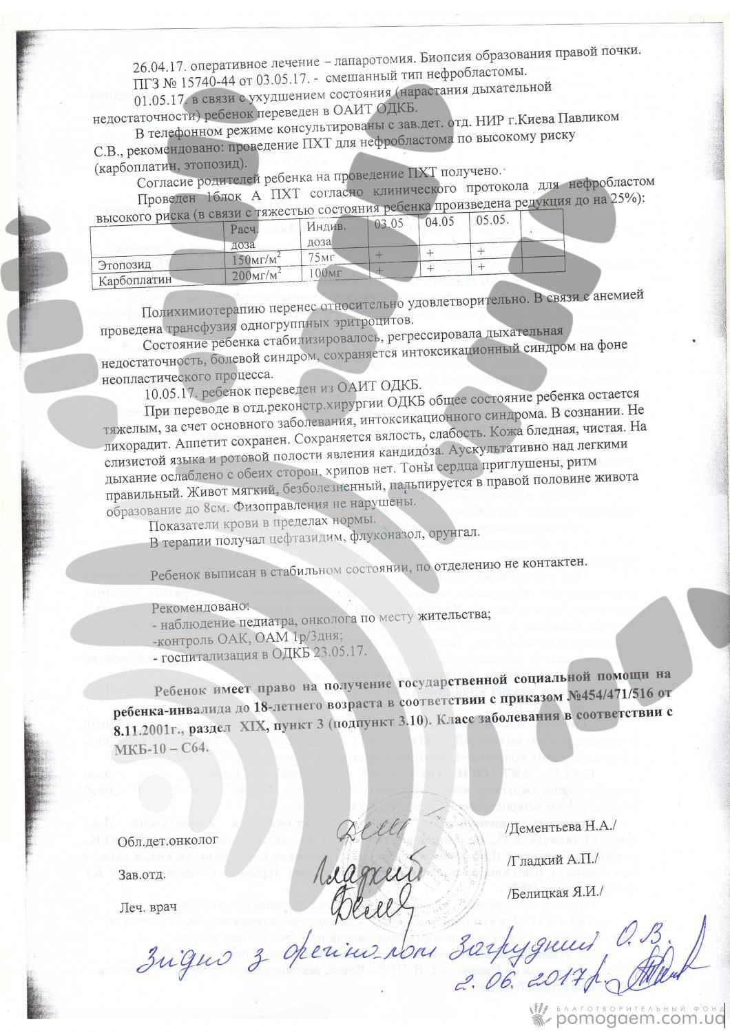 Діагноз:правобічна нефробластома 4 стадії з метастазами в легені й заочеревинні лімфовузли.