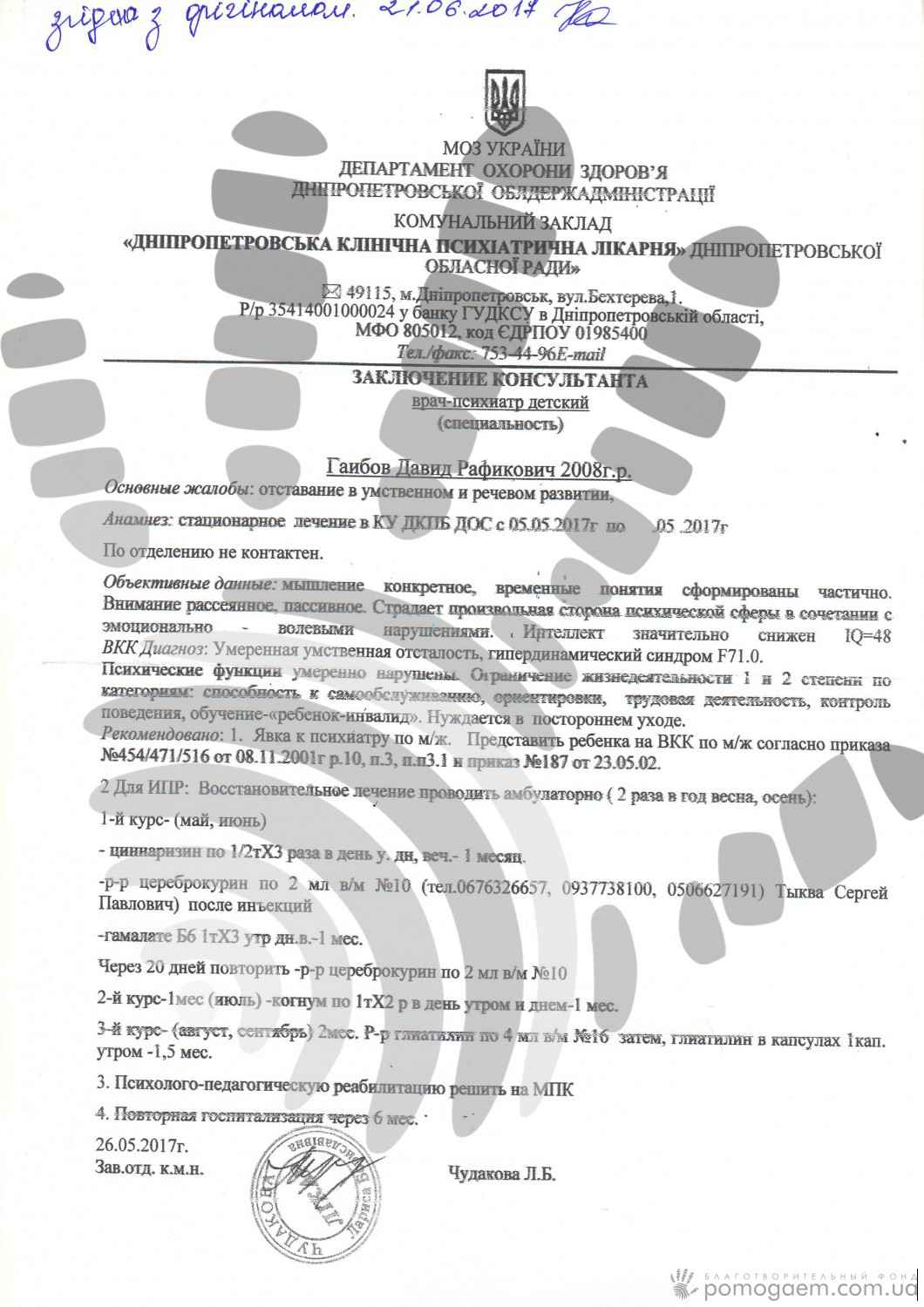 Давиду прописали Цереброкурин і Гамалате-В6; результат першого курсу виявився просто чудовим: дитина відразу стала більш спокійною, розслабилися руки, почала краще малювати, писати цифри й букви. Потрібно обов'язково продовжувати лікування: тепер до нього увійде Цереброкурин, Когнум, Гліатилін. До листопада хлопчикові потрібно на препарати 40 000 грн.