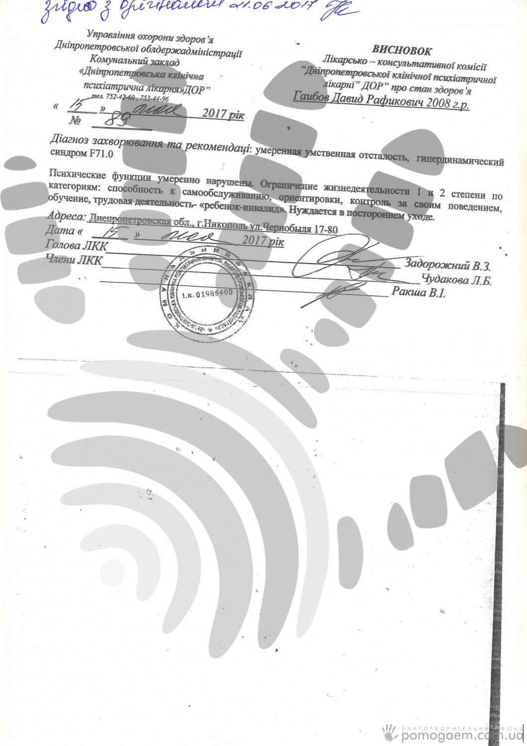 Мама кілька разів зверталася до лікарів зі скаргами на зміни в поведінці та здоров'ї сина, але щоразу її заспокоювали: мовляв, ви себе накручуєте. Коли проблема стала цілком очевидною, Давида, нарешті, направили до обласних психіатрів у Дніпро. Хлопчикові поставили діагноз: помірна розумова відсталість, гіпердинамічний синдром. Лікарі вважають, що в якості бомби уповільненої дії спрацювала гіпоксія, перенесена при народженні, а запустили її шкільні навантаження, які опинилися для хлопчика занадто серйозними.