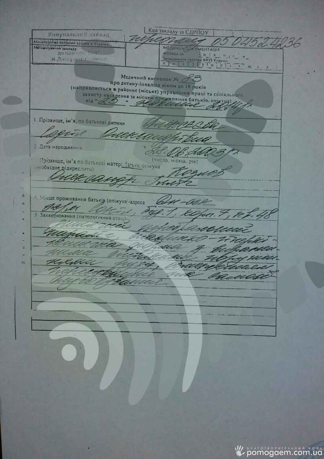 Зараз уже складно повірити, що колись лікарі нічого доброго не обіцяли батькам дівчинки. Внаслідок родової травми й супутньої гіпоксії мозку в Софії зараз стоїть діагноз ДЦП. За прогнозами лікарів дівчинка не мала ні ходити, ні стояти, ні розмовляти. Але завдяки титанічним зусиллям батьків, які з раннього віку зайнялися реабілітацією доньки, Соня не тільки сидить, стоїть біля опори, ходить, спираючись на мамину руку, але й говорить по складах, тримає ручку і навіть малює! Дівчинка навчається у звичайній школі за допомогою асистента вчителя, вона спілкується з однолітками, а це найсильніша мотивація до розвитку для таких діток.