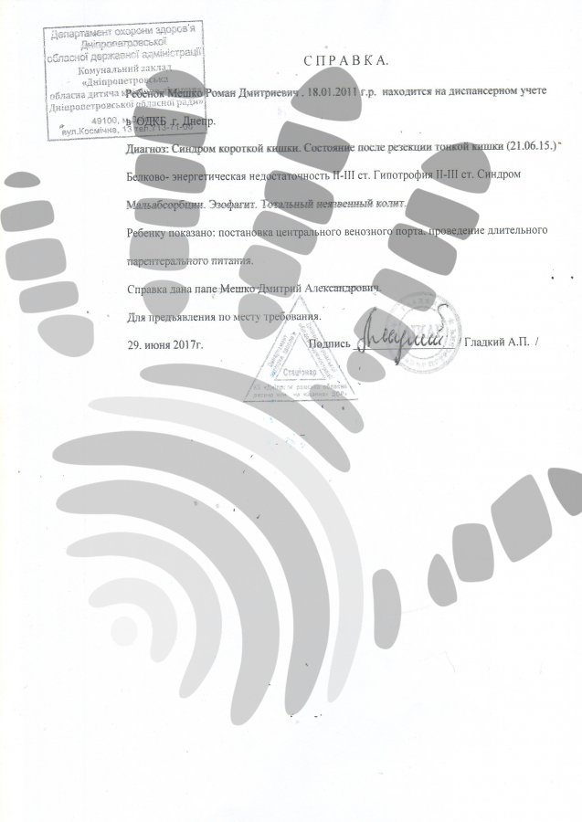 Нагадаємо, що два роки тому Рома переніс операцію з видалення тонкого кишечника, з 2 метрів для життєдіяльності дитини залишилося всього 12 см. Після операції малий кілька місяців отримував дороге парентеральне харчування, на яке ми з вами збирали гроші. Потім рідні за рекомендаціями лікарів годували Ромашку, як його пестливо називають удома, звичайною їжею та спеціальною сумішшю Ресурс Юніор. Але, на жаль, зараз цього вже недостатньо для швидко зростючого організму, й показники фізичного розвитку хлопчика залишаються на рівні три-чотирирічної дитини. Зараз він важить усього 15 кг.