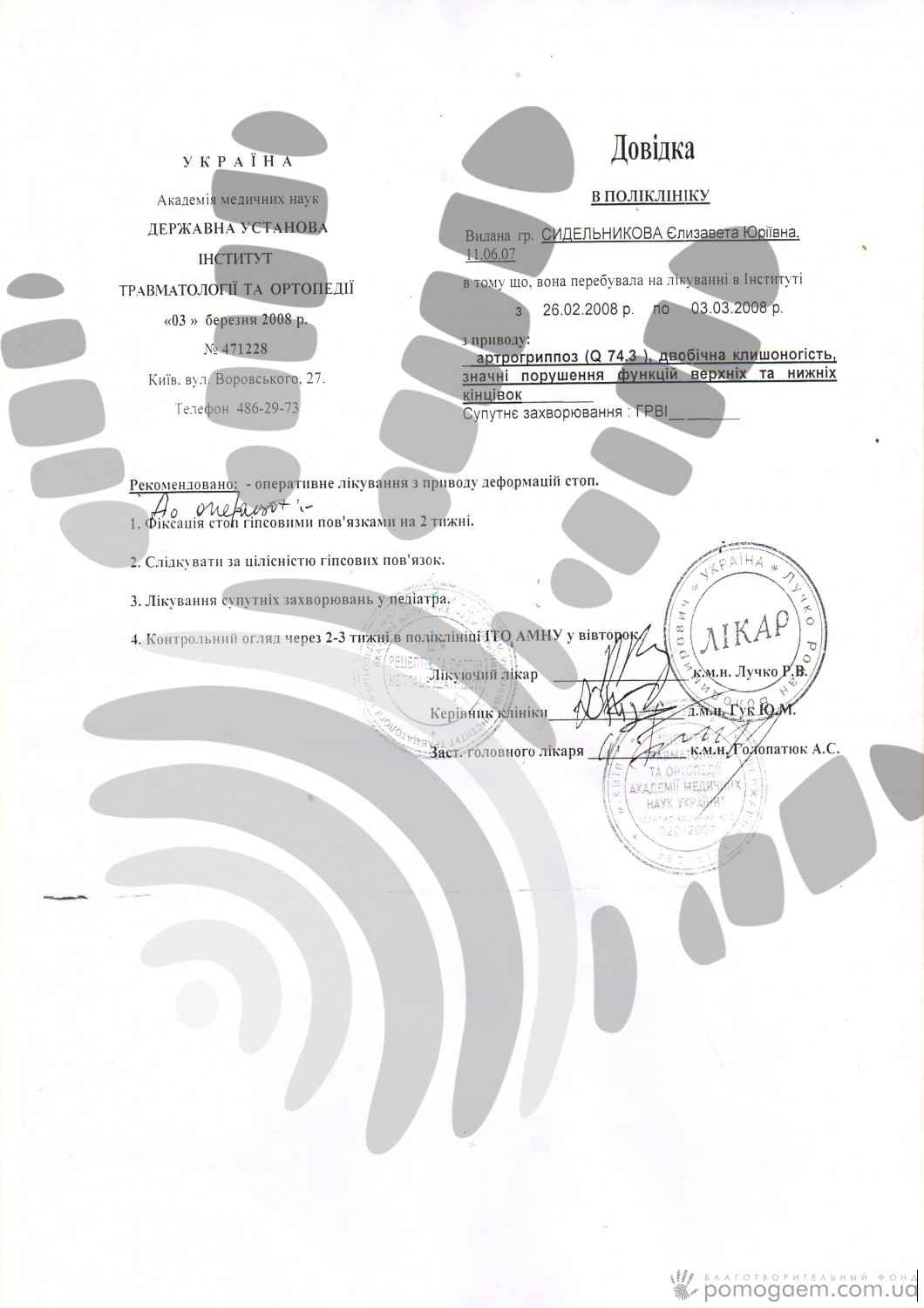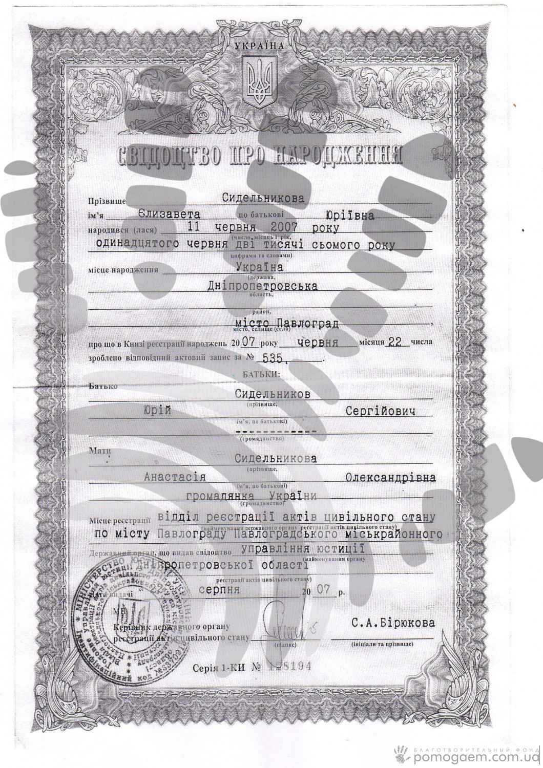 Лізі Сидельниковій10 років, вона перейшла до 5 класу Павлоградського ліцею, успішно здавши ДПА. Ліза отримує грамоти за гарне навчання, займається вокалом, дуже любить малювання й уроки праці. Нещодавно їй подарувалидовгоочікуваний самокат, й вонавчиться на ньому кататися. Часто-густопадає, але наполегливо повторює спроби, й потроху в неї виходить все краще!