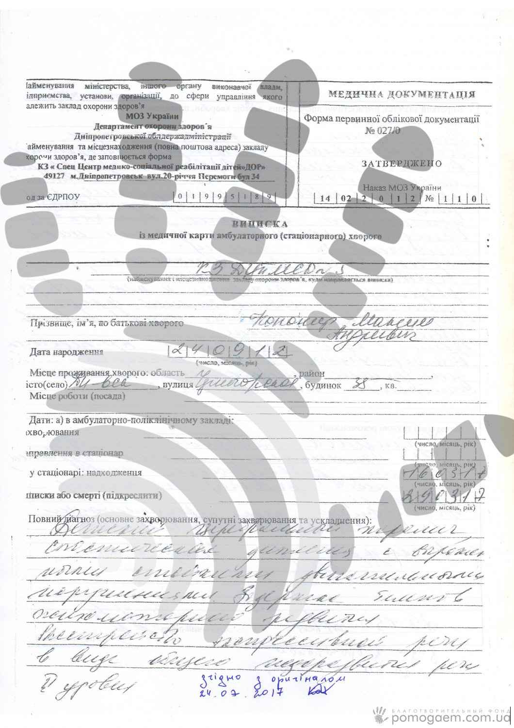 Максим народився раніше терміну, 3 днібув на ШВЛ. Зараз йому майже 5 років, але покищо він сам упевнено не сидить, ходить тільки з підтримкою, а ось їсть самостійно. Максимка дуже життєрадісна, добра, весела, розумна й чуйна дитина. Він любить малювати, слухати музику, співати. Коли мама читає казки, Максимкові найбільше подобається розглядати картинки. Малюк знає всіцифри, букви, розповідає вірші. Йому цікаво гуляти з дітками на вулиці, а от грати в рухливі ігри поки не виходить.