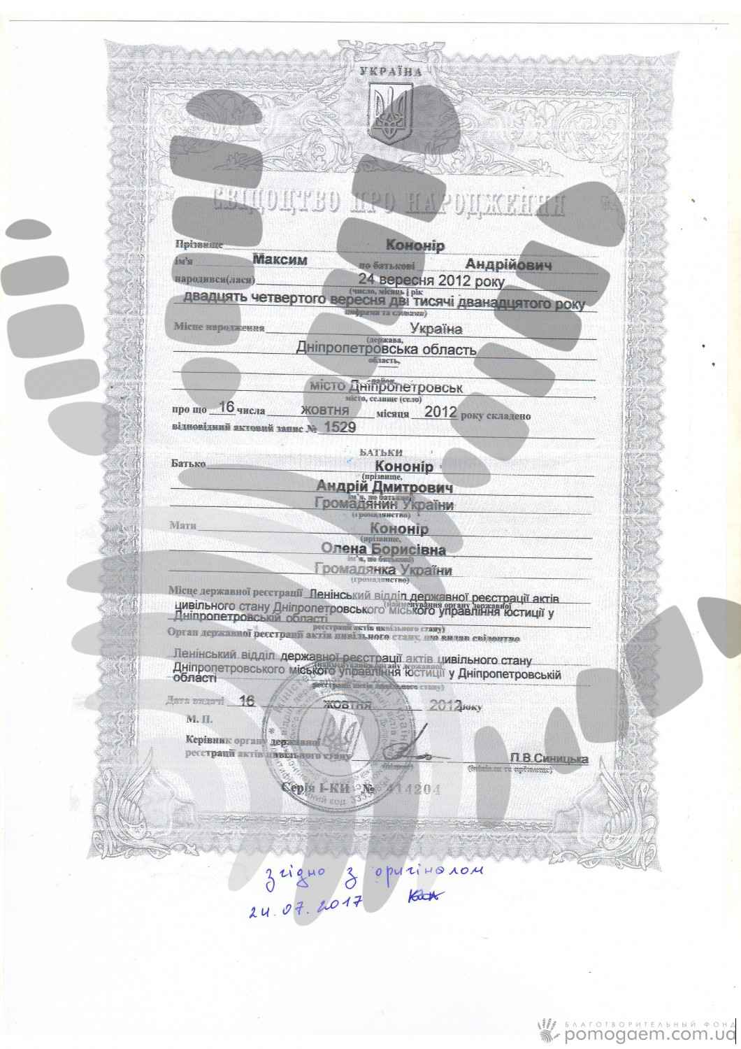 Максимка Кононір живее в Новомосковську. Мама й бабуся – вся його сім'я. Саме вони допомагають малюку щодня долати хворобу: ДЦП, спастична диплегія.