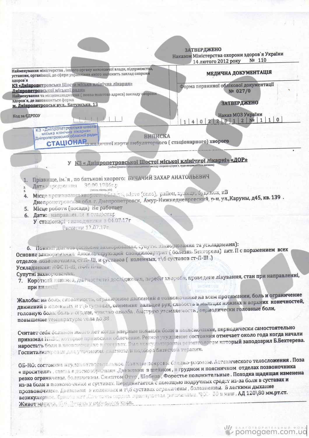 Загострення втазостегновому суглобі почалося в 2015 році, але Захар намагався не звертати уваги на біль, кульгав під час ходьби і відлежувався вдома, прийому гормональних препаратів уникав. Були сили і він працював. Після відпочинку на морі минулого літа і клопоту по ремонту в квартирі перед майбутніми пологами дружини, восени хлопця знову наздогнала біль. Захар пробує різні методики - гомеопатія, апітерапія. Але все давало лише тимчасовий ефект. До нового року різке погіршення хвороби змусило хлопця встати на милиці, ходити без опори він не міг. Турботи про малятку-доньку, народжену в жовтні, лягли повністю на плечі дружини і мами Захара. Проста радість погуляти із коляскою до сих пір йому недоступна.