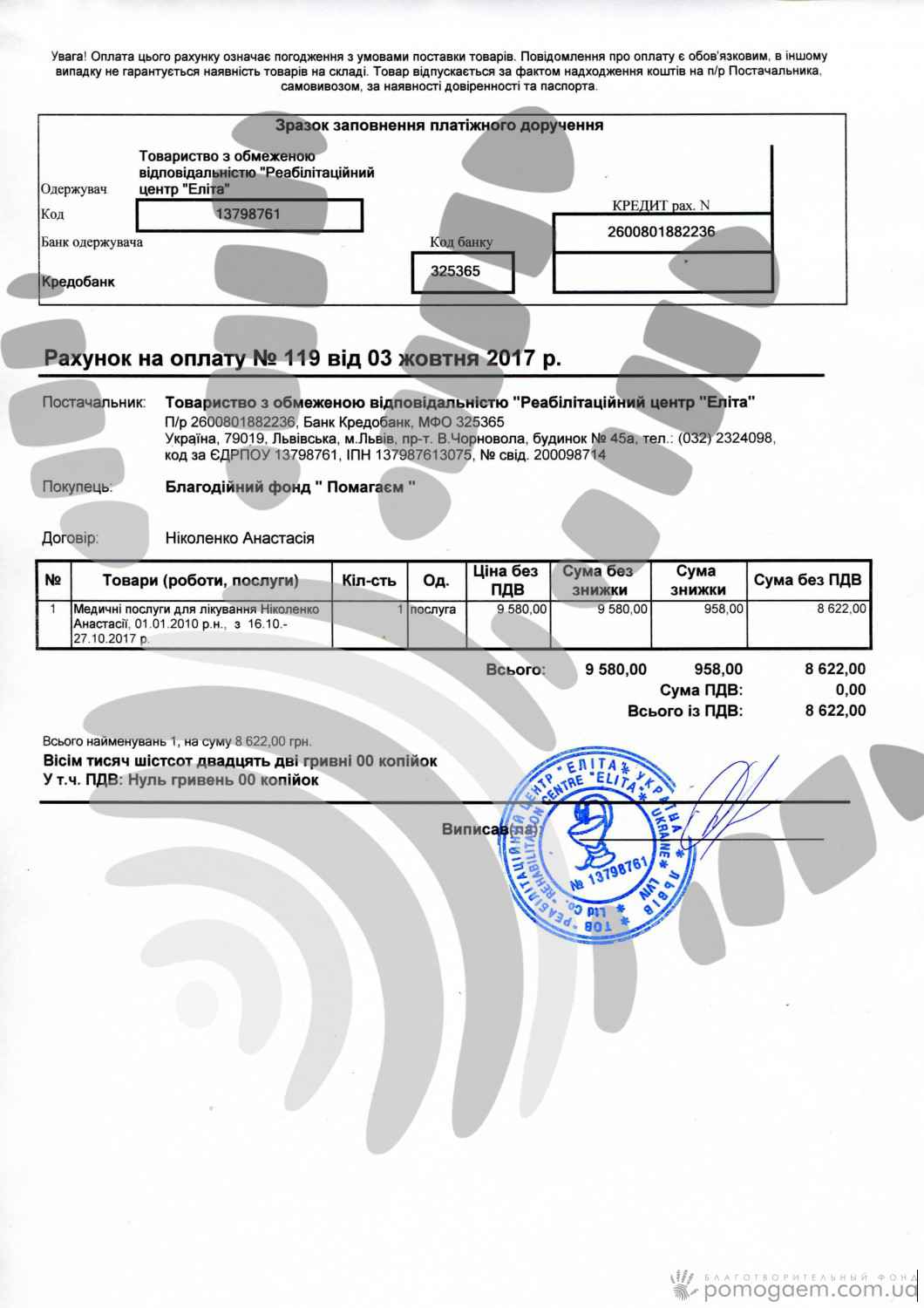 | 05.10.2017 | Харь Альона Тарасівна | 300,00 |