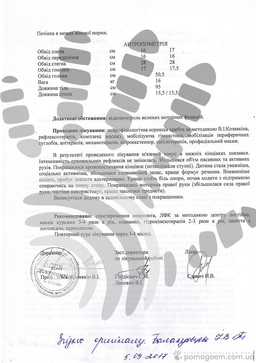 Але Данька мріє побільше спілкуватися з іншими дітками – піти до дитячогосадка. Так що йому дуже потрібно встати на ніжки. Й до цієї мети його наближають саме заняття й процедури в МВКЛ: буквально кожен курс дає нові вміння. На 27 листопада призначено чергова реабілітація, вартість якої 9 765 грн.