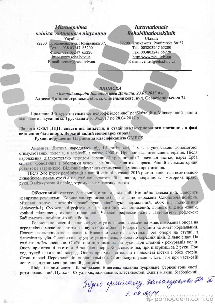 Даня народився з вагою 4 900 г, пологи були дуже важкими. Асфіксія, судомний синдром, перелом лівого плеча, парез Ерба – всі ці діагнози, поставлені після народження, один за одним компенсувалися, але в рік з'явився новий – ДЦП. Тільки за допомогою реабілітації в Міжнародній клініці відновного лікування Данька став розвиватися фізично, причому для дитини з ДЦП – семимильними кроками.