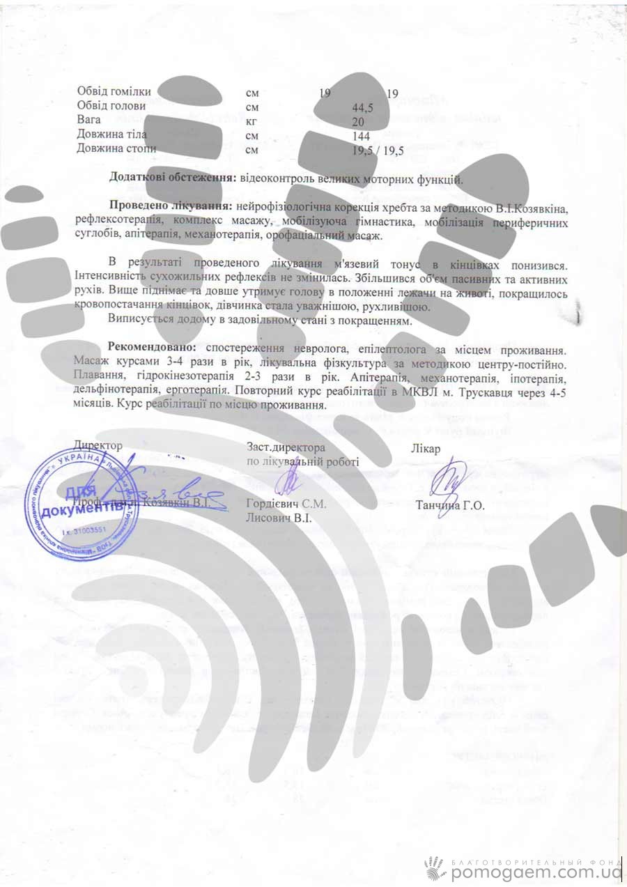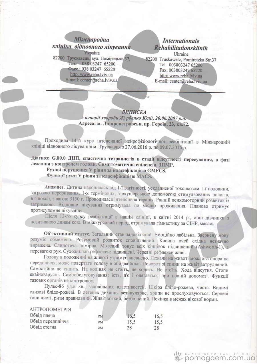 Через родовутравму з перших днів життя Юлечки батькам довелося боротися за її життя. 7 років тому ми познайомилися з дівчинкою, й двічі ви допомагали оплачувати для неї реабілітацію в Міжнародній клініці відновного лікування. Всього Юля пройшла 14 курсів в МВКЛ. Із кожним курсом приходять відчутні результати у відновленні рухових функцій.