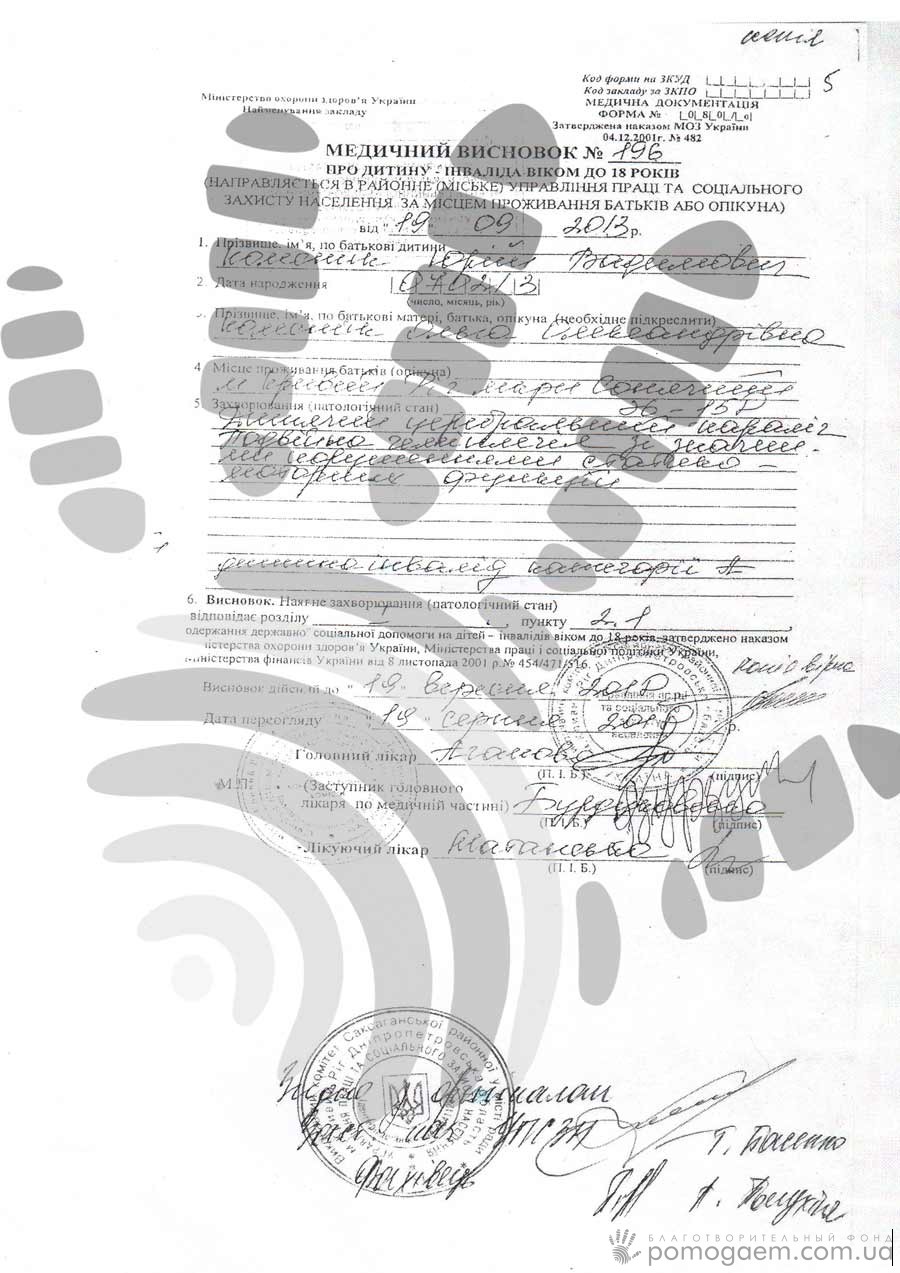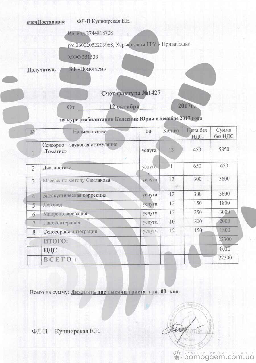 Вартість послуг – 22 300 грн. Для Ольги це абсолютно нереальні гроші, а разом ми з вами обов'язково допоможемо Юрчикові пройти ефективну реабілітацію! Перевести посильну для вас суму можна за допомогою реквізитів або миттєвого платежу онлайн.