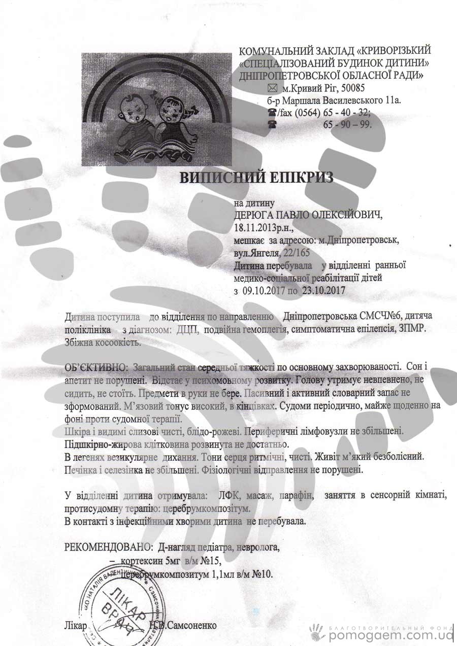 Всупереч прогнозам лікарів Павлуша в свої 4 роки вже спирається на ніжки й тупотить з підтримкою мами, вчиться тримати голову, спиратися на ручки й сидіти. Протисудомна терапія зменшила кількість нападів до 1-2 в день. Стимулює його фізичний розвиток реабілітація в Кривому Розі й Борисполі, масажі й ЛФК вдома в Дніпрі. Поки Павлику всього 4 і його організм використовує всі ресурси для відновлення, потрібно досягти найбільшого результату. Найближчий курсу центрі «Вільний рух» обійдеться в 12 500 грн, і ми дуже просимо вас допомогти рідним Павлуші зібрати кошти на оплату путівки!