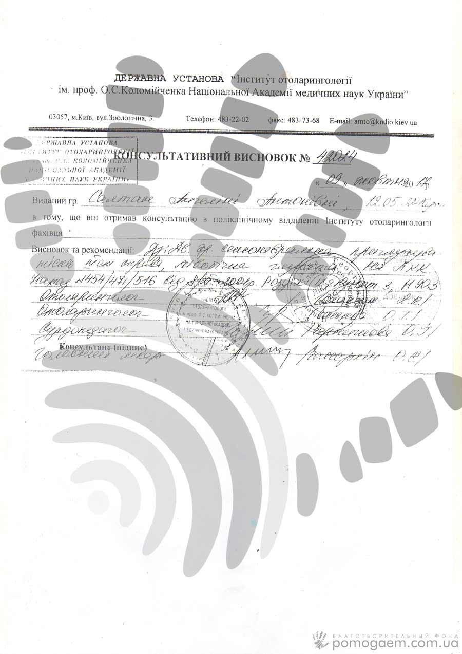 «Все було як уві сні, – пише мама. – Спливало багато питань: що заподіяло це? Чи лікується воно? Як це прийняти? Як дитині з цим жити? За що?» Тоді ми ще не знали про таку чудо-техніку як слухові апарати й кохлеарна імплантація. Поставили слуховий апарат, але місяць носіння апарату позитивного результату не приніс. Ми твердо вирішили робити кохлеарную імплантацію, але коли ми отримали рахунок на операцію, у нас опустилися руки».