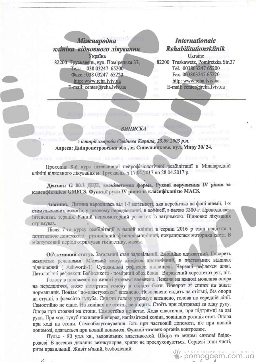 На 10 січня в Кирила призначений черговий курс реабілітації в Міжнародній клініці відновного лікування. Він буде коштувати 11 940 грн. Крім нас, оплатити його нікому. Після того, як ми вперше відправили Кирила на реабілітацію до Трускавця, мама зворушила співробітників програми «Здоров'я», сказавши, що вони з сином уже й не сподівалися ні на чию допомогу, а ми повернули їм віру в людей і надію на поліпшення здоров'я.