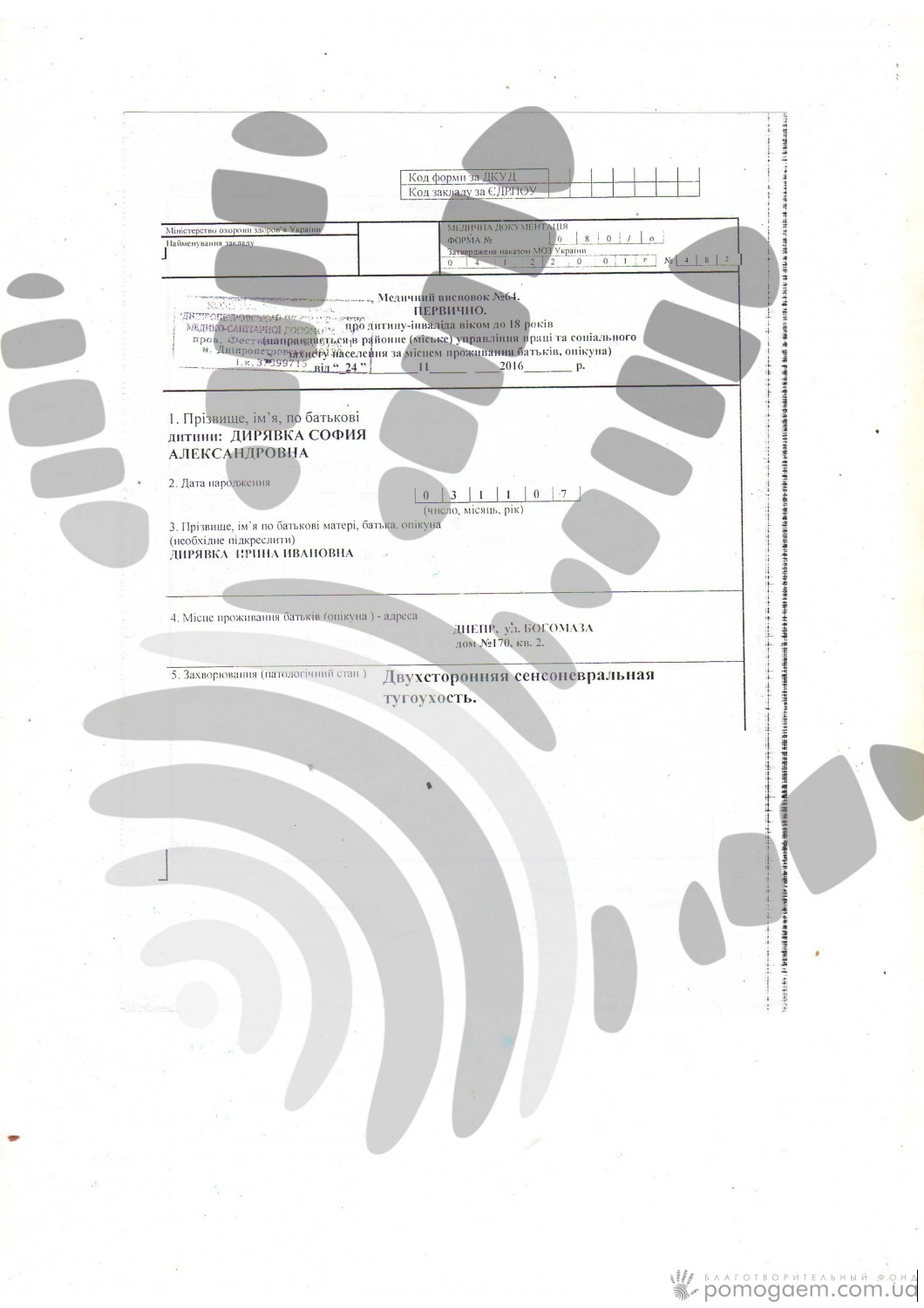 Зараз Соня вчиться в 3 класі, дуже любить малювати й танцювати (займається у шкільній студії), але розмовляє, на жаль, погано. Дівчинка стоїть на обліку вневролога й приймає дорогі препарати, що стимулюють роботу тих центрів мозку, які відповідають за розвиток мовлення. Але щоб навчитися нормально говорити, дитині потрібно добре чути.