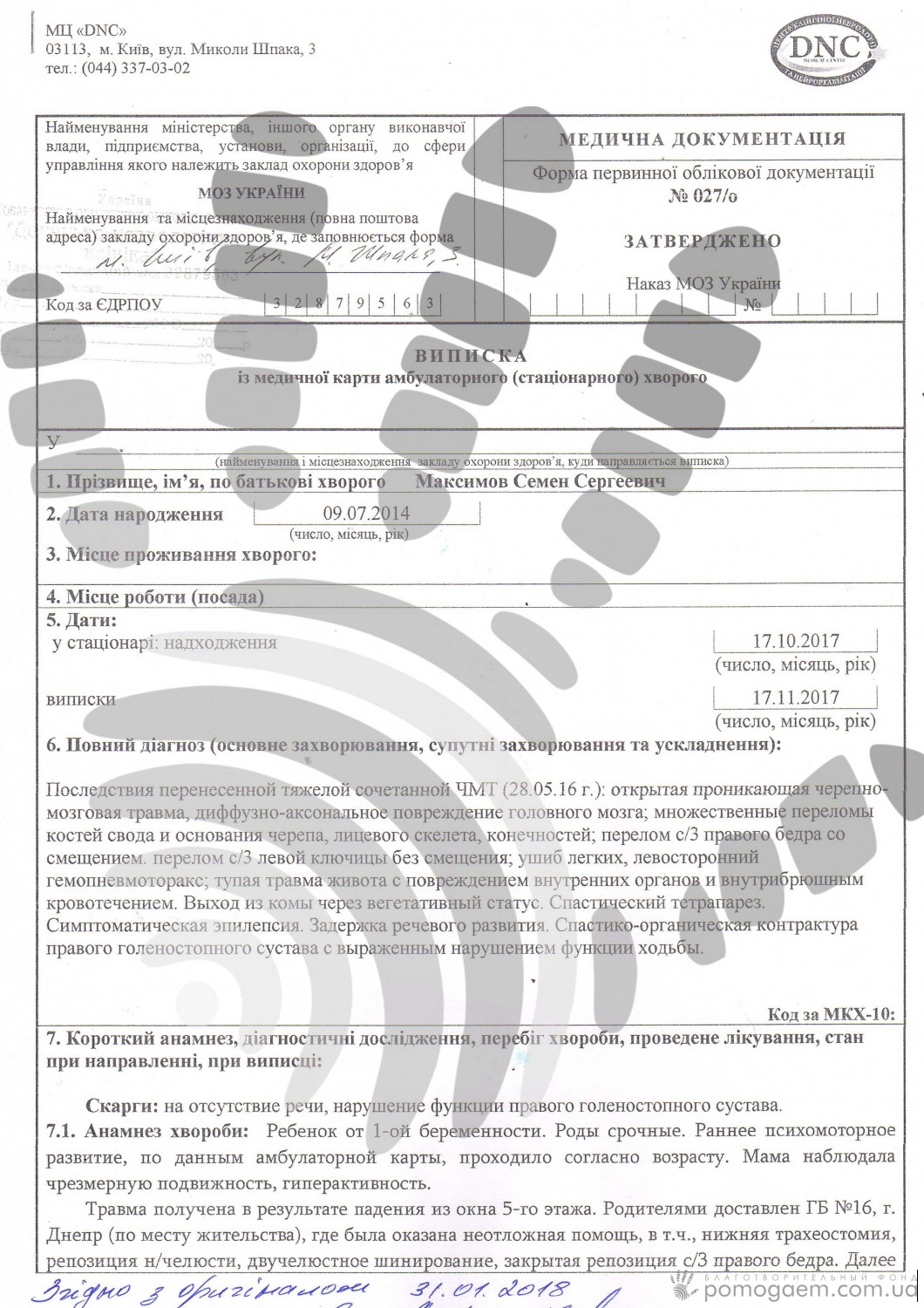 Ще місяць дитина пролежала в неврології в Дніпрі, а потім її направили до київського Інституту педіатрії, акушерства і гінекології. Потім хлопчик перебував на реабілітації в Медичному Центрі "DNS", ми як раз допомагали зібрати кошти на цей курс лікування.
