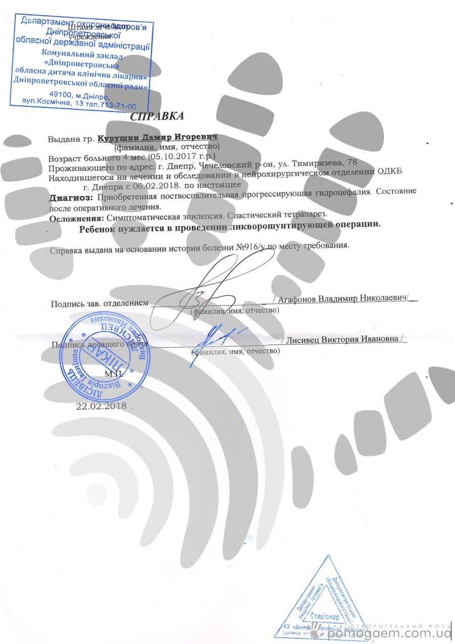 Діагноз: придбана постзапалювальна прогресуюча гідроцефалія. Симптоматична епілепсія. Спастичний тетрапарез.