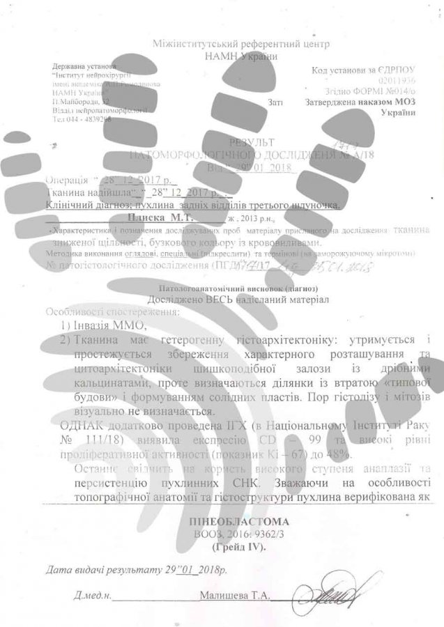 Діагноз:внутрішньомозкова пухлина пінеальної ділянки з поширенням уІІІ і правий боковий шлуночки (пінеобластома), гідроцефалія