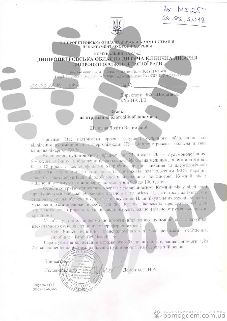 Васкулярні сканери бувають різні. Батьки з Асоціації хворих на муковісцидоз обговорювали варіанти з медиками й консультантами й вирішили зупинити вибір на трансіллюмінаторі Vein Finder з 3 режимами освітлення виробника Brightfield healthcare. Він допоможе знаходити точки для ін'єкцій в найважчих місцях. Один сканер буде переданий пульмонологічному відділеннюдніпровської Міської дитячої клінічної лікарні №2, другий – у пульмонологію Обласної дитячої клінічної лікарні.