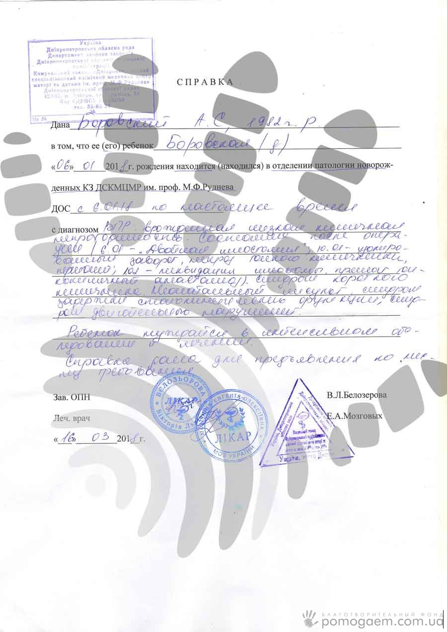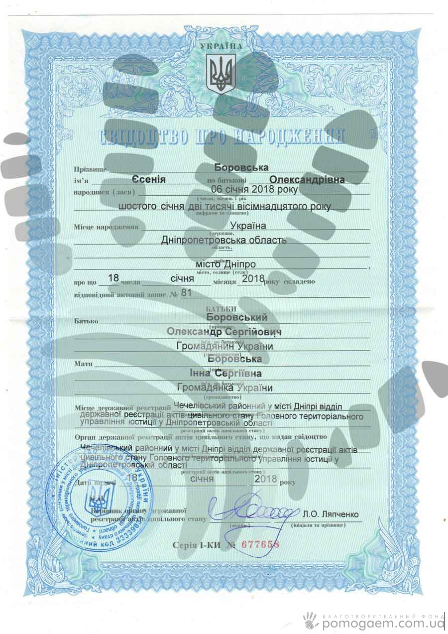Тричі хірурги перекроювали кишечник немовляти, видаляючи некротизовані частини, виводячи стоми, роз'єднуючи спайки. Після другої операції стався інсульт. Але попри все, Єсенія потроху зростає й розвивається, набрала вагу з 2700 р до 3400, їсть спеціальну суміш із пляшечки, вже стежить поглядом за тим, що відбувається.
