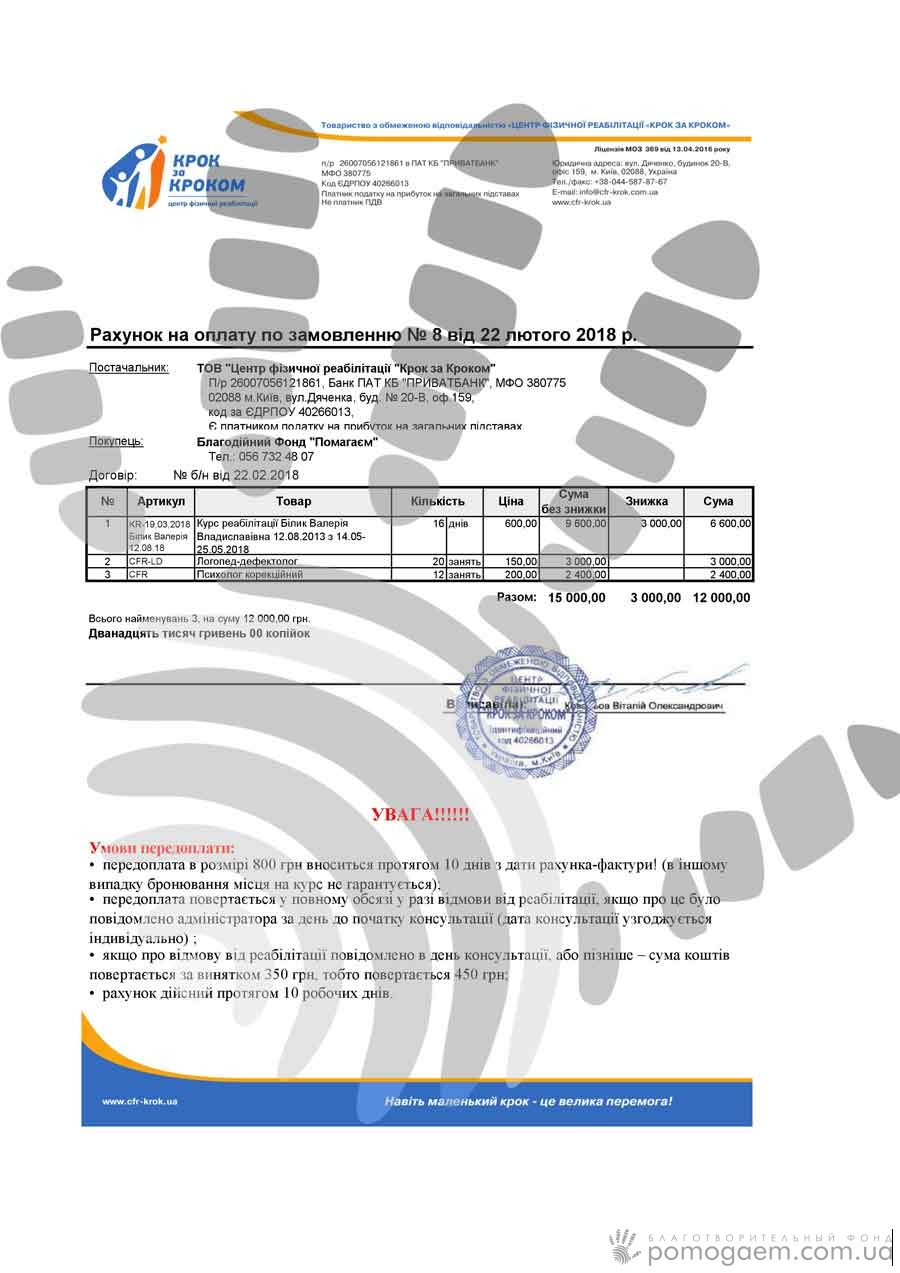 14 травня в маленької почнеться реабілітація в центрі «Крок за кроком» – там дівчинка буде відновлюватися вперше. Батьки сподіваються, що знову вдасться поповнити запас усвідомлених рухів руками. Щоб оплатити курс, потрібно 12 000 грн, і це не по кишені Лєріним батькам. Давайте дамо дівчинці можливість розвиватися далі!