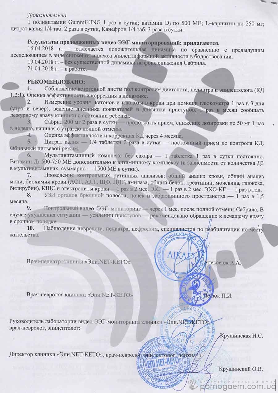 Багато хтопереживав за Олю – й кето-терапія спрацювала: напади стали все рідше атакувати крихітку! Регулярно Аня возить доньку в клініку на корекцію лікування. Сьогодні від дівчаток прийшли чудові новини. Уже в жовтні Оленьку перевели на половинну частку Сабрілу (протисудомного препарату). Під час останнього курсу в Чернівцях у квітні Олі тричі робили енцефалограму – результат відмінний. І лікарі дали команду поступово знижувати дозу Сабрілу до нуля! Схоже, дитина перемагає епілепсію!