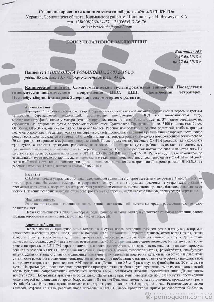 Ми добре пам'ятаємо, як до нас вперше прийшла мама Олі Таніч; дитині тоді не було йроку. Десятки разів на день немовля вигиналося в болісних судомах. Розвиток стояв на місці: дитина не виявлялаемоції й навіть не фокусувала погляд; не допомагали ніякі протисудомні. Але Олина мама Аня – справжній боєць, вона не збиралася здаватися. Освіти медучилища їй виявилося достатньо, щоб знайти ту єдину методику, яка мала допомогти Олі. Це кето-терапія – використання спеціальної дієти, яка дозволяє багатьом діткам забути про епі-напади.