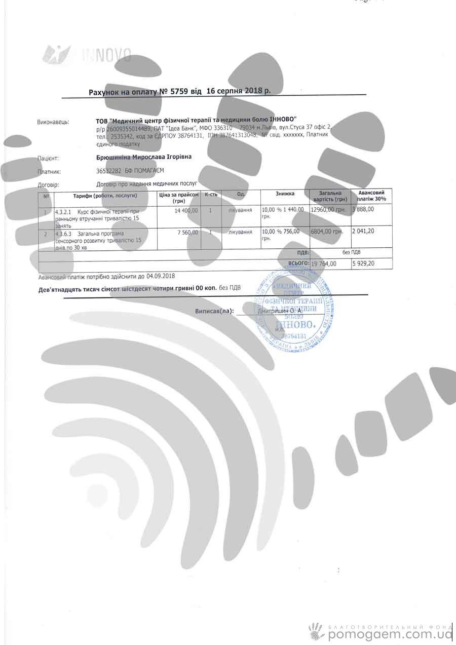 У жовтні на Мирославу чекають у Львівському центрі "ІННОВО" – все це обійдеться в суму 19 764 грн. І звичайно, знайти такі гроші дуже важко для сім'ї з двома дітьми, один з яких має діагноз ДЦП. Давайте об'єднаємо зусилля, щоб допомогти нашій Мирославі!