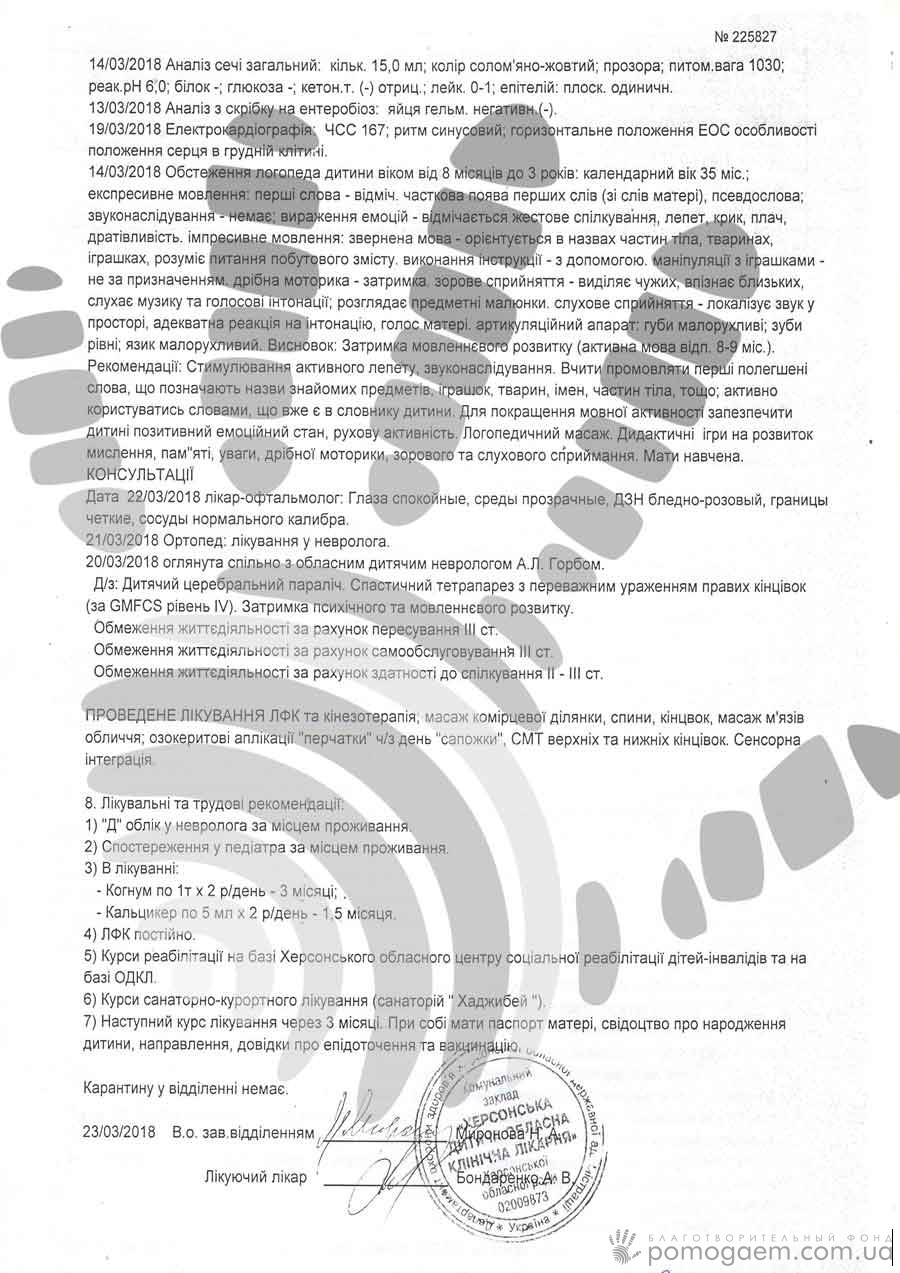 Діагноз: ДЦП, спастичний тетрапарез, затримка психічного та мовного розвитку