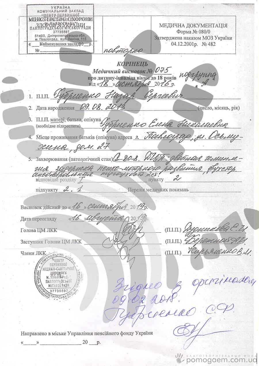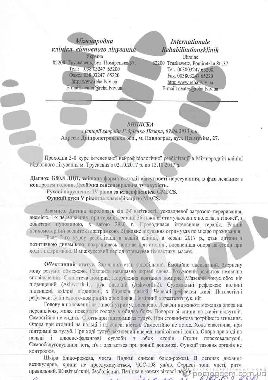 Наступний курс в Трускавці обійдеться в 10 746 грн, а ще близько 5 000 грн потрібно буде на проїзд і зйомну квартиру. Значна частина коштів родини йде на поточні витрати й медикаментозне лікування, тому за допомогою в оплаті реабілітації вони звертаються до небайдужих людей. Давайте допоможемо Назарчику встати на ніжки!