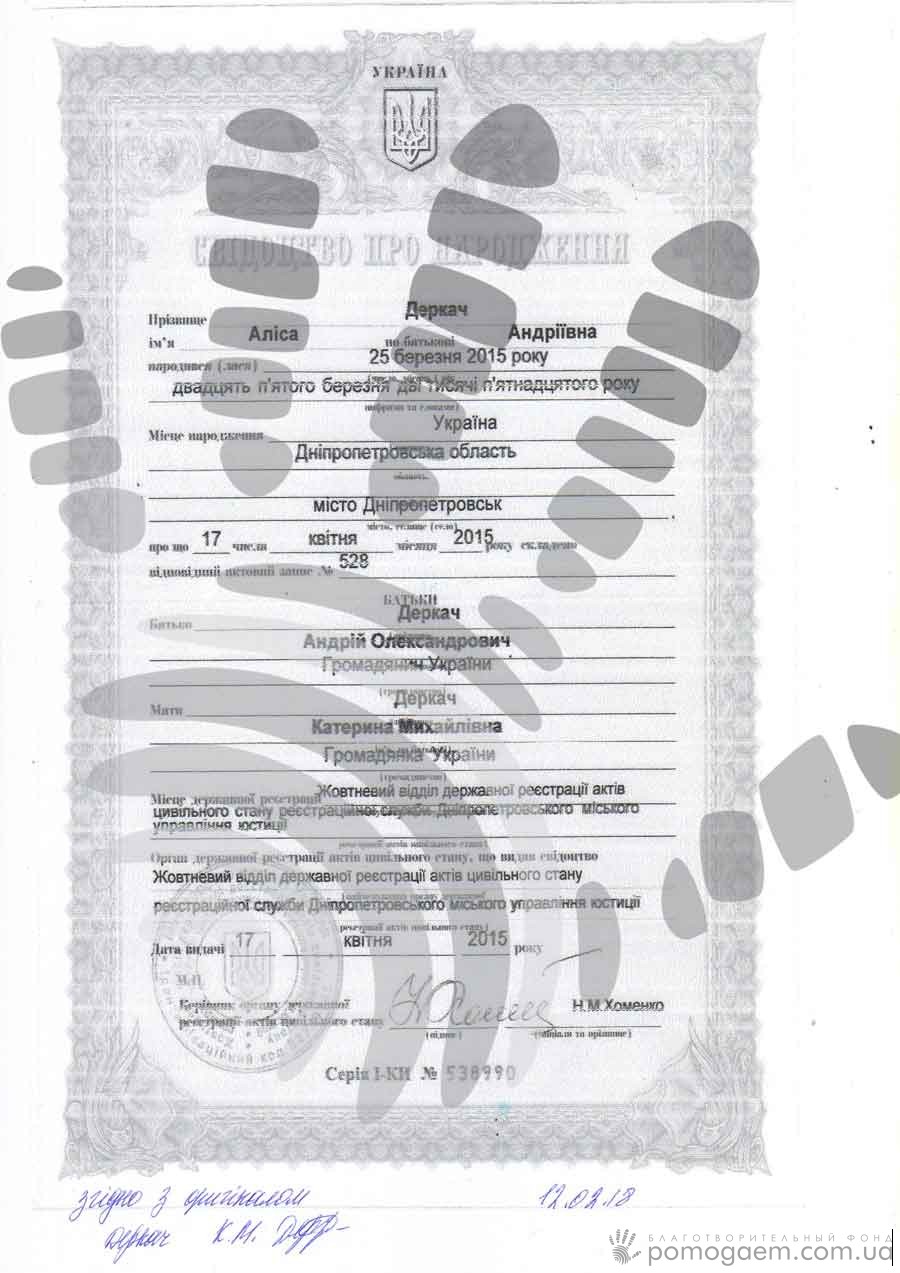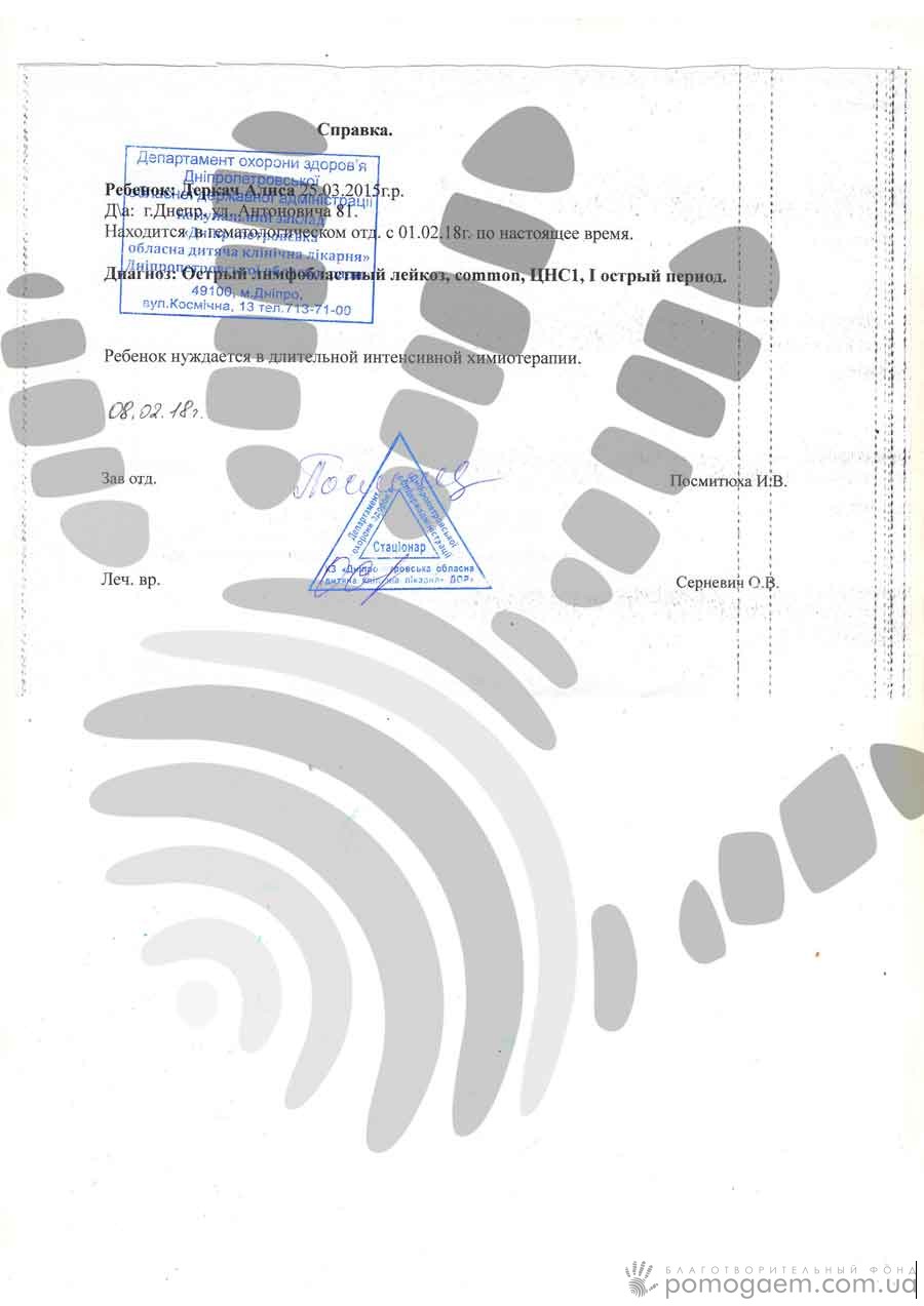 Давайте згадаємо всю історію Аліси спочатку. Весела, непосидюча крихітка, що обожнює танцювати, люблячі батьки, які не можуть надивитися на свою донечку – такою була сім'я Деркач ще рік тому. Все змінилося в середині січня. Висока температура не збивалася 5 днів, лікування не допомагало. Дівчинку госпіталізували й діагностували пневмонію. А за якийсь час на ніжках почали з'являтися синці. Дитину направили до гематолога. За результатами пункції встановили діагноз: гострий лімфобластний лейкоз. Взагалі-то, синці стали в нагоді – Алісу почали лікувати вчасно.