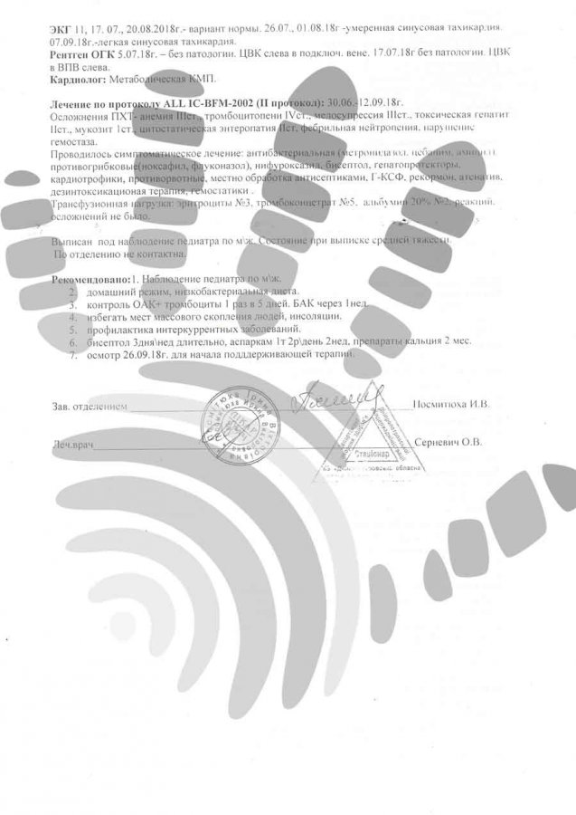 9 місяців малюка лікували устаціонарі. Це були важкі 9 місяців. Головна зброя лікарів – хіміотерапія – б'є не тільки по лейкозу, але й по організму дитини. Регулярно «падали» показники крові, йтоді Гері переливали кров і «капали» Альбумін. Страждала печінка, яку також постійно підтримували спеціальними препаратами – гепатопротекторами. Коли зростав ацетон, малюка переслідувала нудота, коли були низькі тромбоцити – він весь час спав.