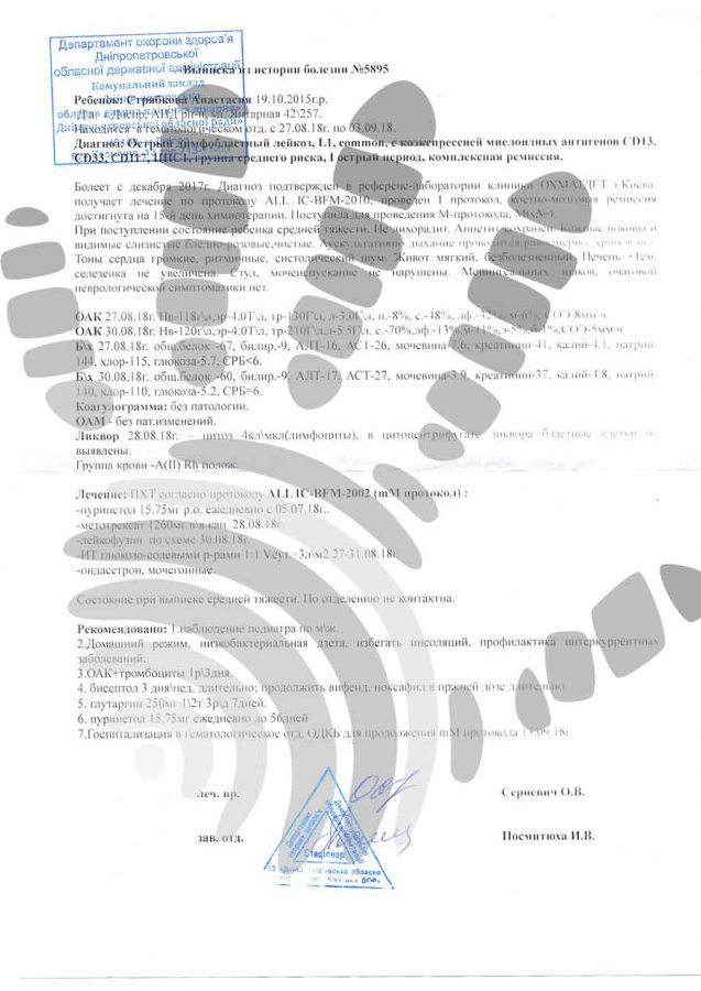 Зараз Настя проходить другий протокол лікування, приймає Цитозар. Два тижні тому вона перенесла ГРВІ, пройшла курс антибіотиків, вчора знову піднялася температура йзнову їй почали давати антибіотики. Переривати хіміотерапію не можна, залишається тільки сподіватися, що організм дитини витримає йхворобу, й агресивне лікування.