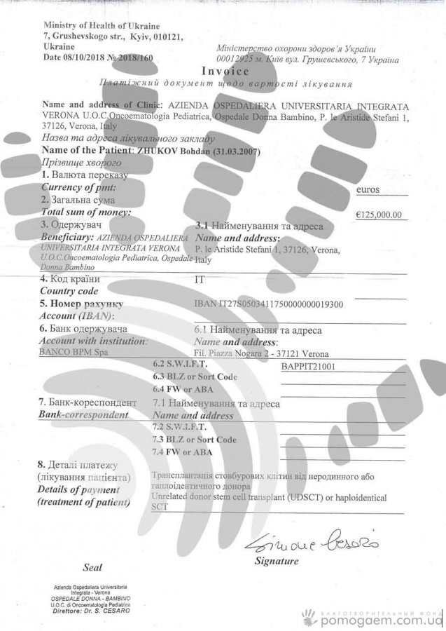 Прийшов рахунок з Італії для Жукова Богдана. Квиток у майбутнє. Ціна 125 000 євро. Дорого, дуже дорого. Але хіба цього не коштує життя дитини? 5 років тому в 6-річного Богданчика з Павлограда виявили лейкоз. Це було дуже страшно, але виявилося, що може бути страшніше: у дитини алергія на два важливих хіміопрепарата. Діставали інші, за божевільнуціну – і все-таки Богдан увійшов у ремісію. Повернувся додому, вчився, грав у футбол, танцював... А потім стався рецидив. Потрібна трансплантація кісткового мозку, й надія тільки на вас. Будь ласка, допоможіть купити для хлопчика шанс на життя!