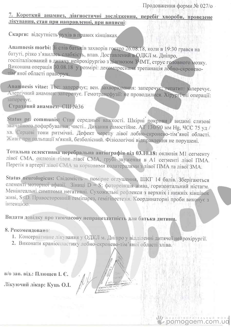 Від Данькивідвели загрозу життю, але цього недостатньо. Наслідки інсульту проявилися в рухових порушеннях. Даня погано ходить, погано працює права рука, проблеми з мовленням. Щоби дитина повернулася до колишнього життя, потрібна серйозна робота з професійними реабілітологами.