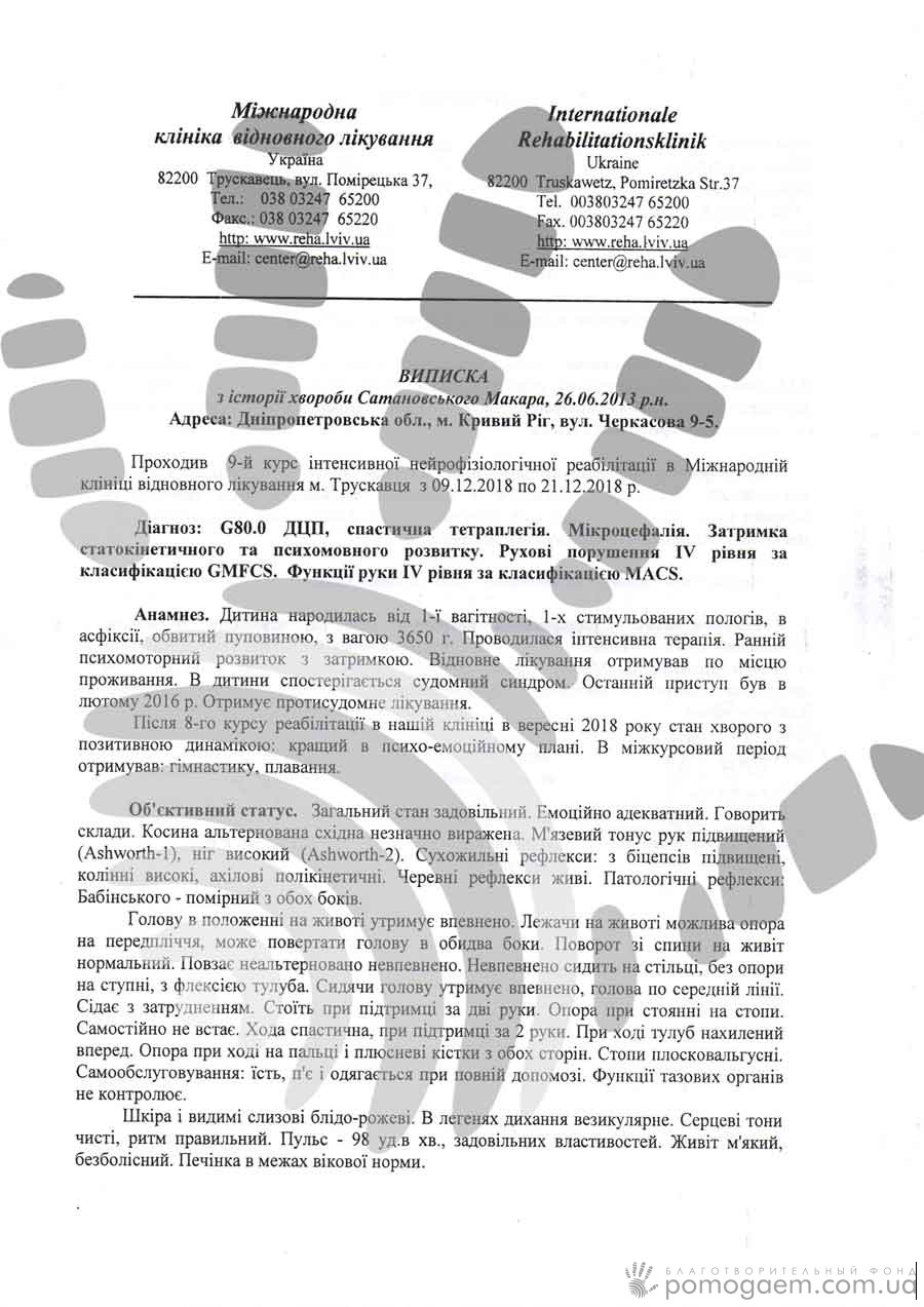 Близькі роблять усе можливе, щоб дитина продовжувала розвиватися: відвідують басейн, ходять на іпотерапію, а вдома обладнали для сина спортивну кімнату, щоби хлопчик щодня займався фізкультурою. Нещодавно повернулися з Трускавця, лікарі вражені успіхами Макара! Для закріплення результату потрібна ще одна реабілітація. Уже в березні маму з сином знову чекають у Міжнародній клініці відновного лікування. Для оплати потрібні 11 646 грн.