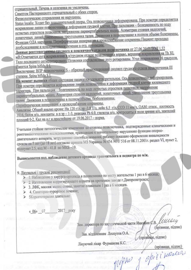 Діагноз: вроджена вада розвитку хребта, кіфоз 4 ст.