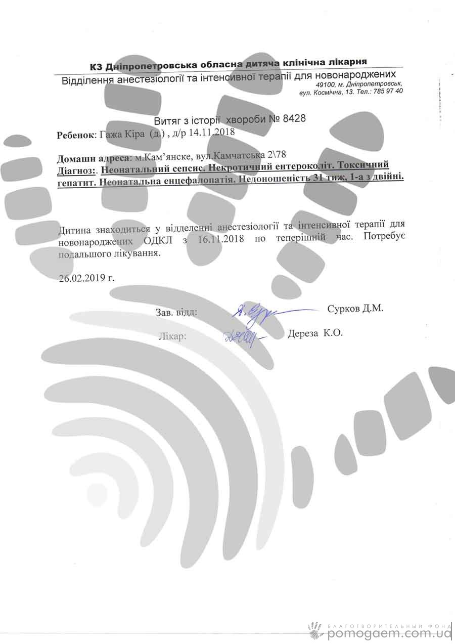 Проте дитина досі на антибіотиках. Спроба припинити внутрішньовенний прийом антибіотиків 2 тижні тому привела до плачевних наслідків: за дві доби вага знизилася з 1 580 г до 1 290 г Довелося знову ставити катетер. Зараз вага відновився – 1 616 г, і поки Кірюша не набере ще, вона буде приймати антибіотики. А кілька днів тому довелося робити переливання крові – дівчинка випадково витягла катетер, відкрилася кровотеча, впав гемоглобін.